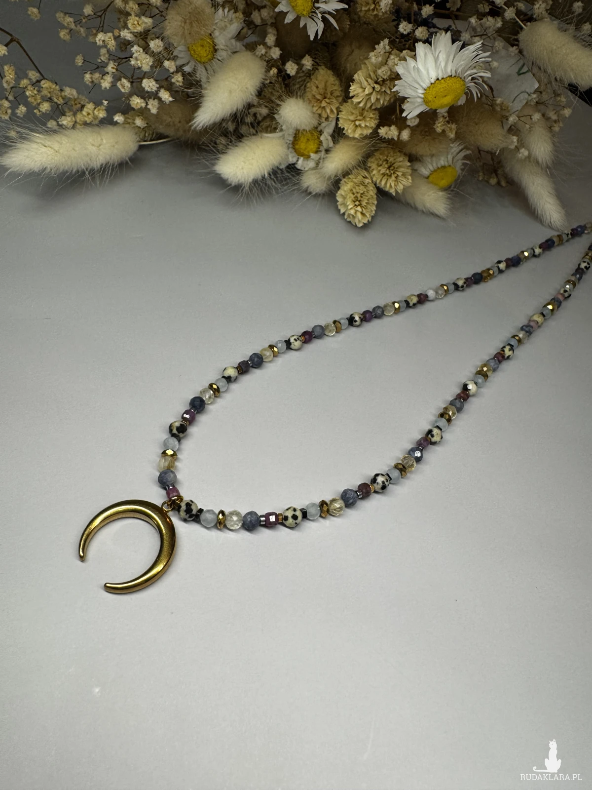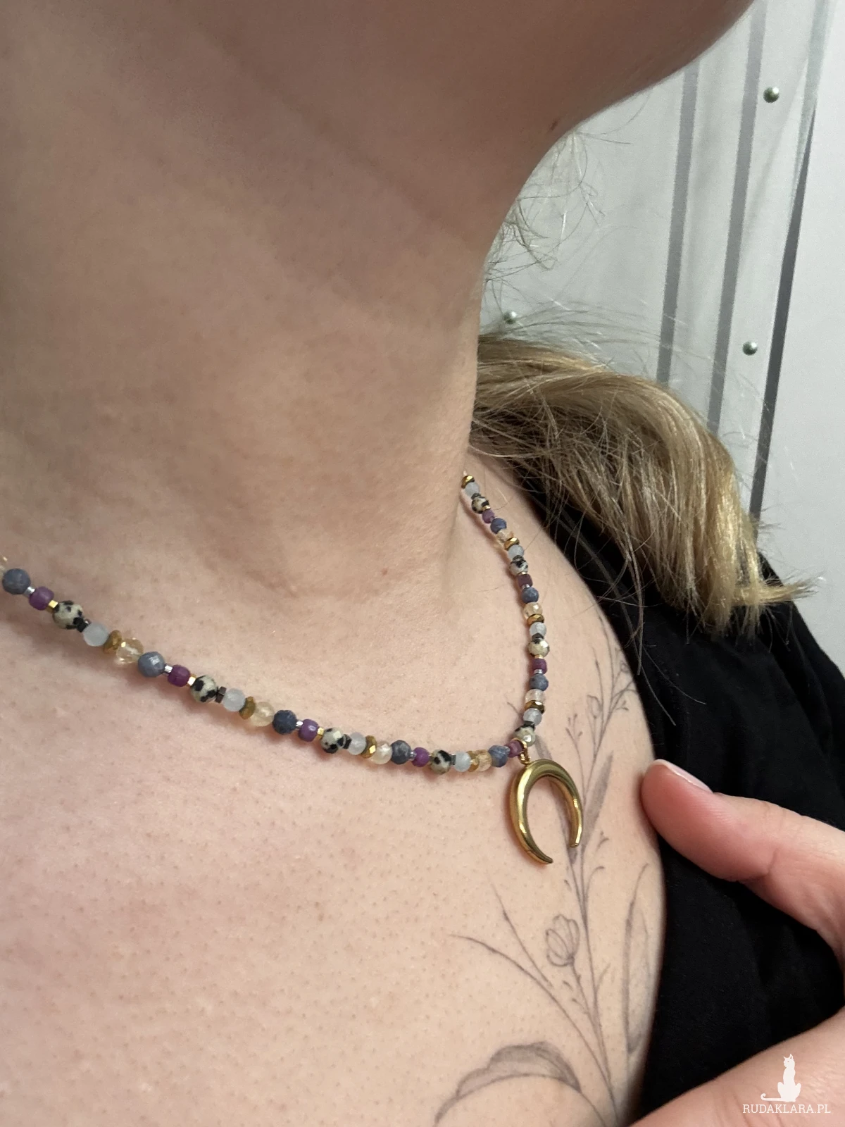 Naszyjnik, w delikatnych, wręcz pastelowych odcieniach kamieni szlachetnych, w całości zrobiony z małych, 2-4 koralików akwamarynu, jaspisu dalmatyńskiego, rubinu, korala, onyksu oraz cytrynu. przyciągnie spokój i dobrobyt, wspomoże asertywność i oraz ułatwi wyrażanie myśli i uczuć. wyrażanie.