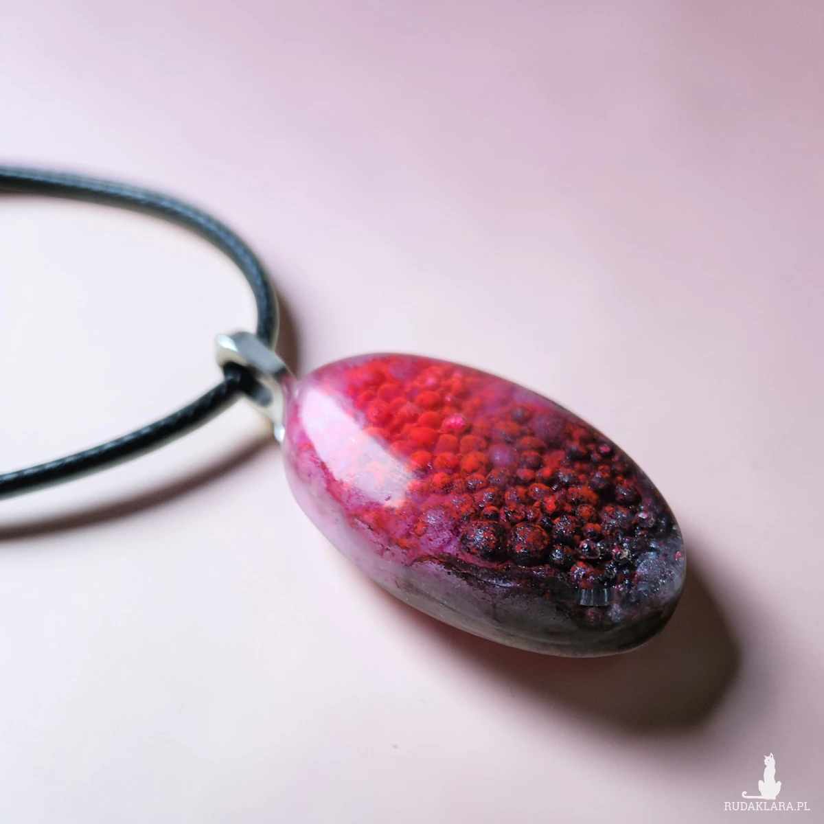 Oferuję wyjątkowy naszyjnik wykonany ręcznie z wysokiej jakości żywicy. Zawieszka w kształcie owalnym zachwyca efektem 3D – wewnątrz zatopiona została struktura przypominająca drobne czerwone kryształki/bąbelki, które tworzą niepowtarzalny, głęboki efekt wizualny.
