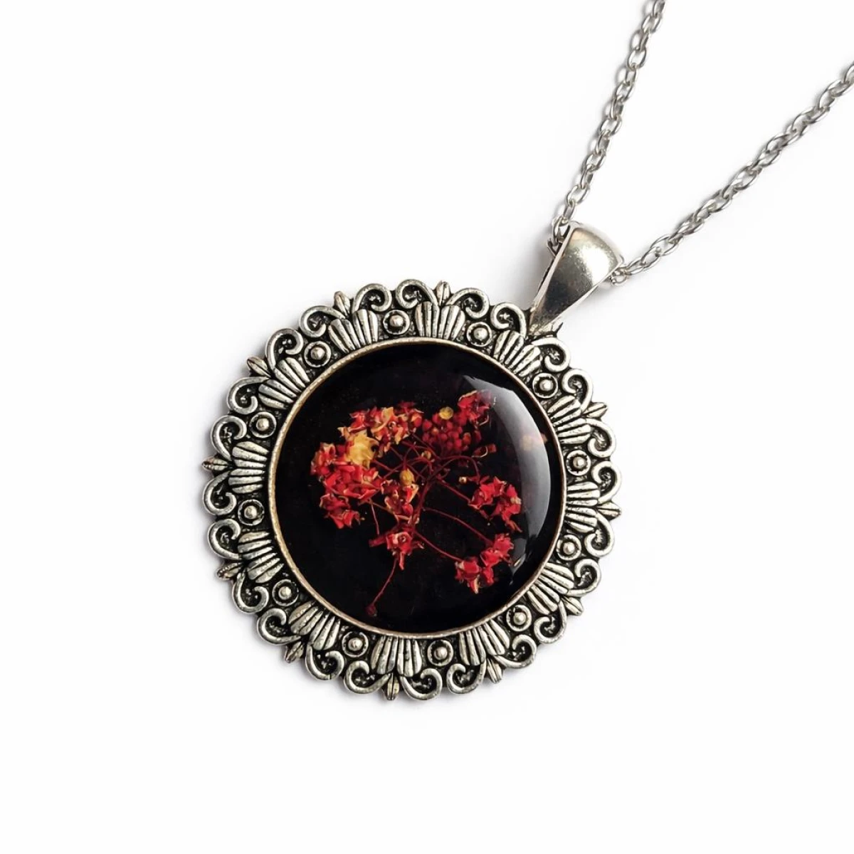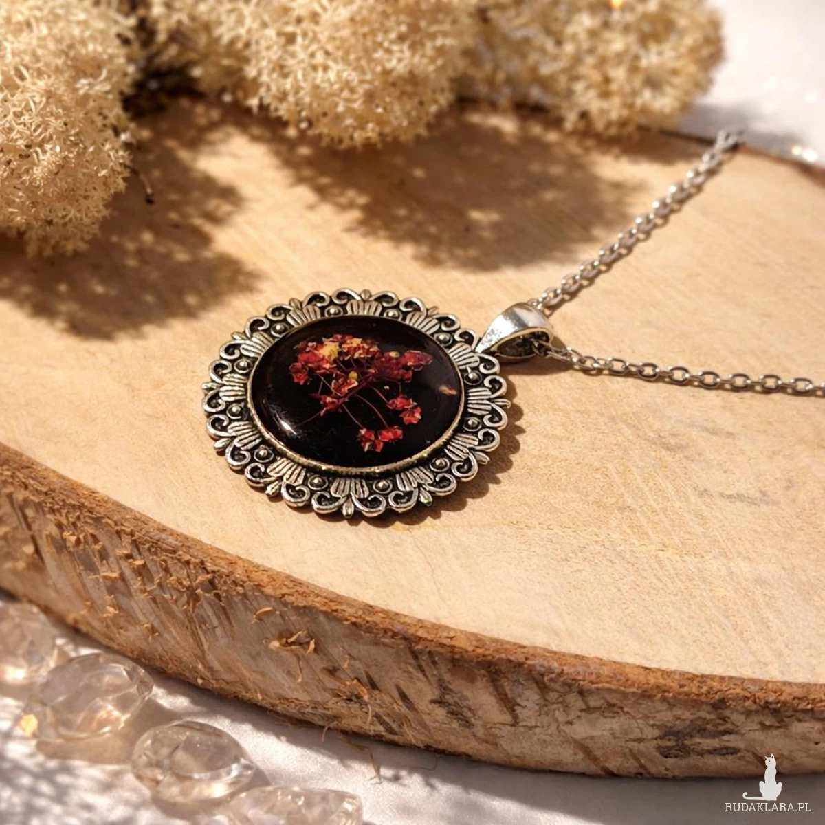 Unikatowy wisiorek handmade wykonany z wysokiej jakości żywicy epoksydowej, w której zatopione zostały naturalne czerwone kwiaty smagliczki. Głębokie, czarne tło pięknie podkreśla intensywność koloru kwiatów, tworząc elegancki i wyrazisty efekt.