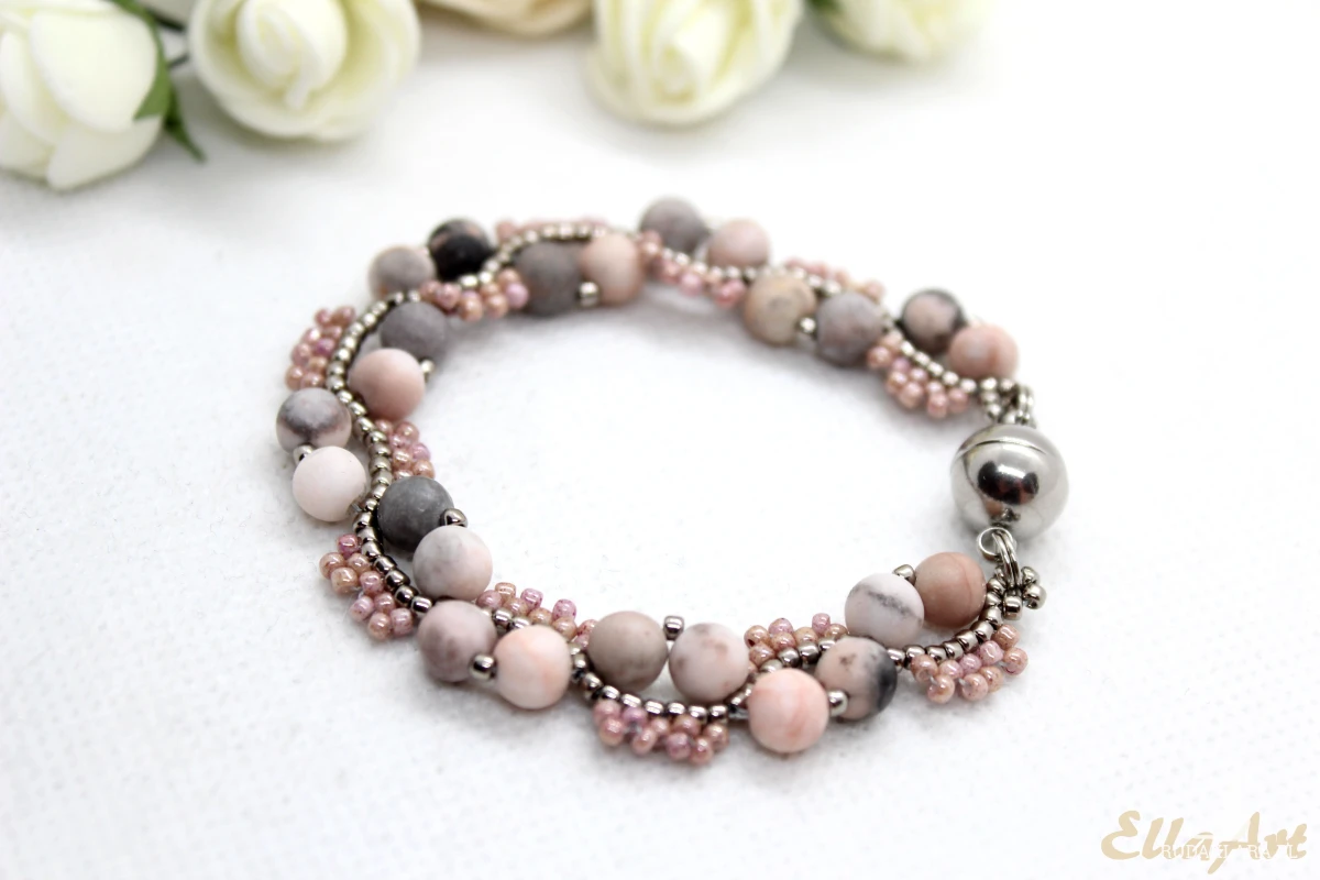 Bransoletka uszyta z kamieni naturalnych jaspisu "Pink zebra" oraz drobniutkich, szklanych koralików japońskiej firmy Toho.