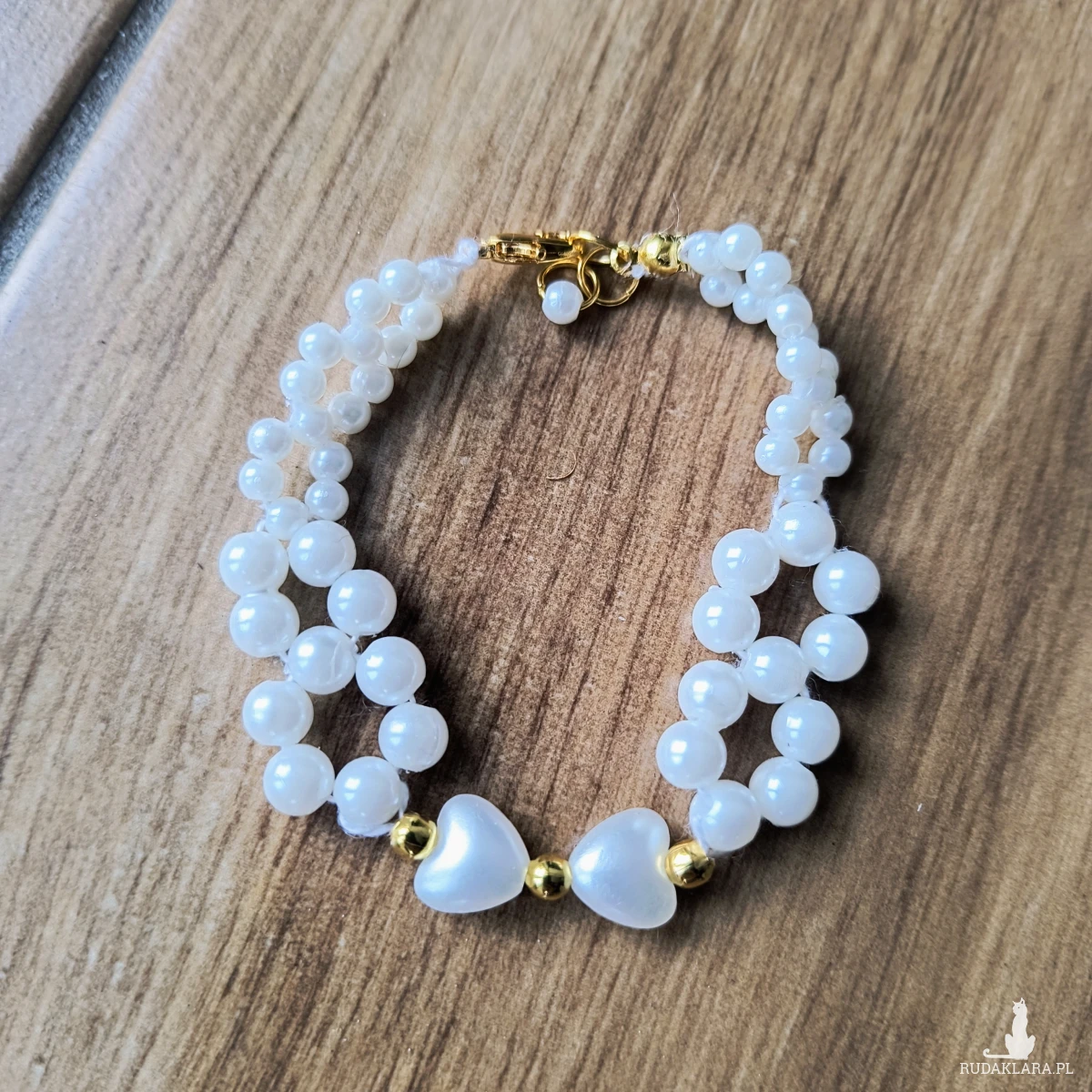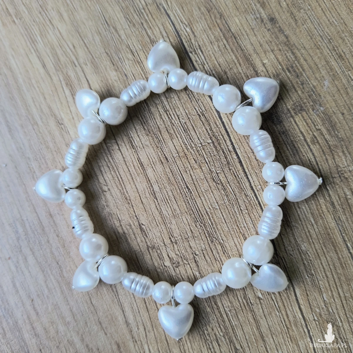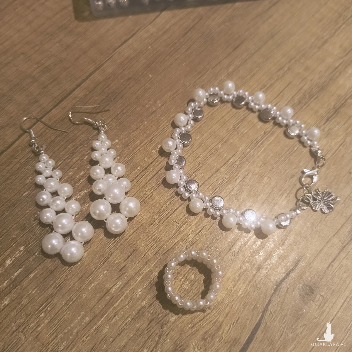 Perłowy zestaw z koralików. Naszyjnik ma zapięcia w kolorze złotym,bransoletka dodatki w kolorze srebrnym. Jest u mnie dostępna bransoletka perłowa na gumce bez dodatków. Można stworzyć swój zestaw za jedyne 30zł. Może składać się on z 3 elementów do wyboru: