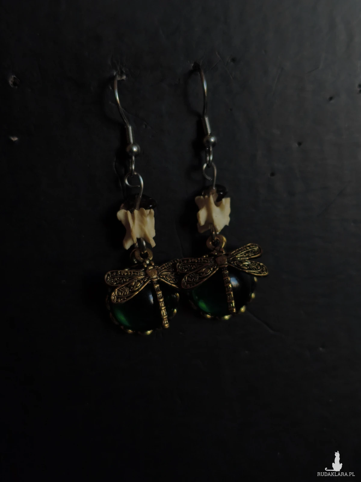 Stal nierdzewna. Zawieszka z ważki na zielonym tle pochodzi z zepsutych kolczyków z odzysku
