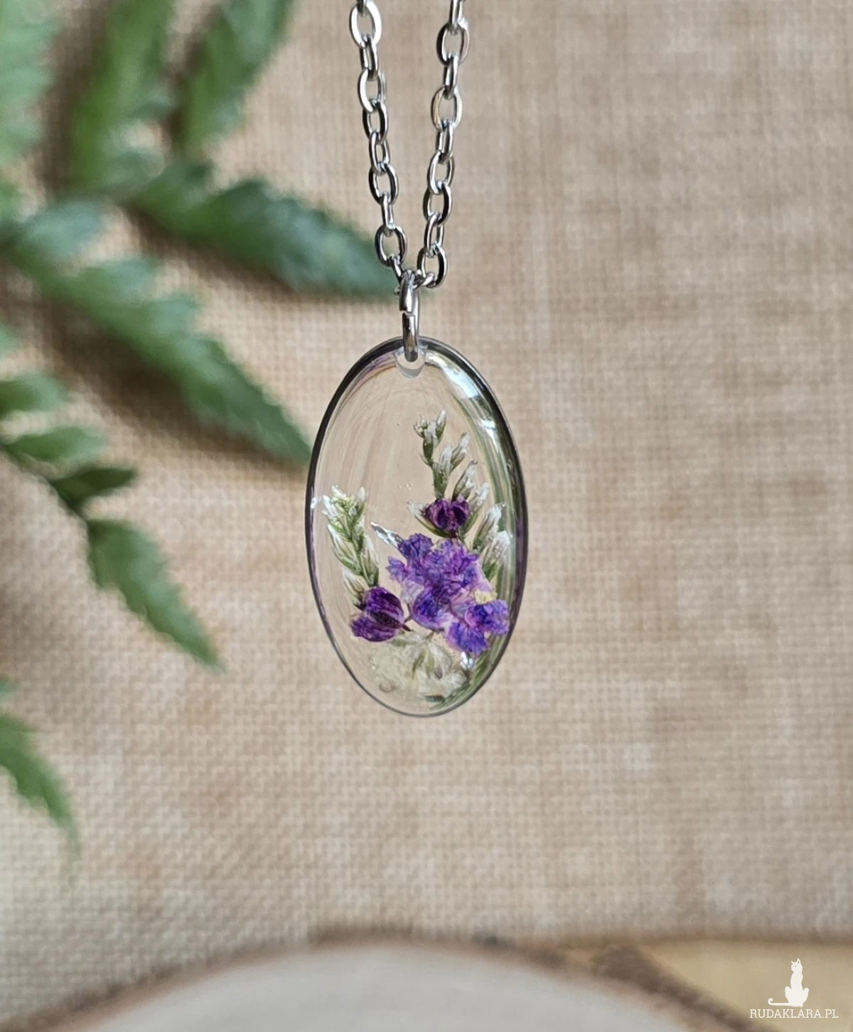 Oferuję Państwu unikalną biżuterię. Zawieszka jest wykonana z suszonych kwiatów i żywicy epoksydowej. Biżuteria jest wspaniałym i oryginalnym prezentem na lata.