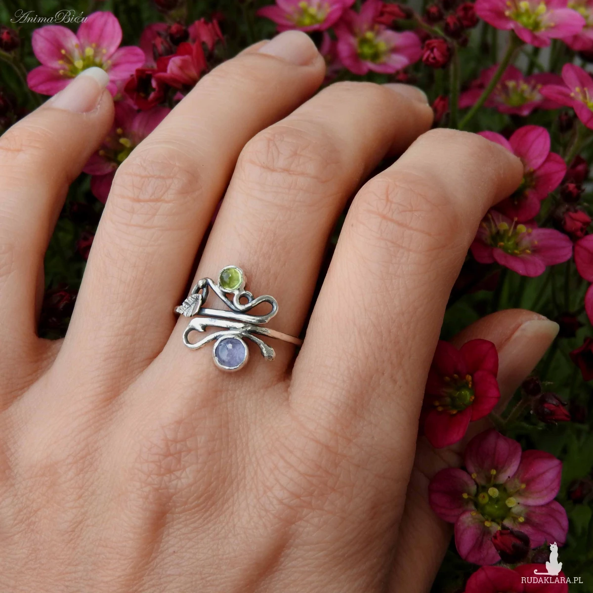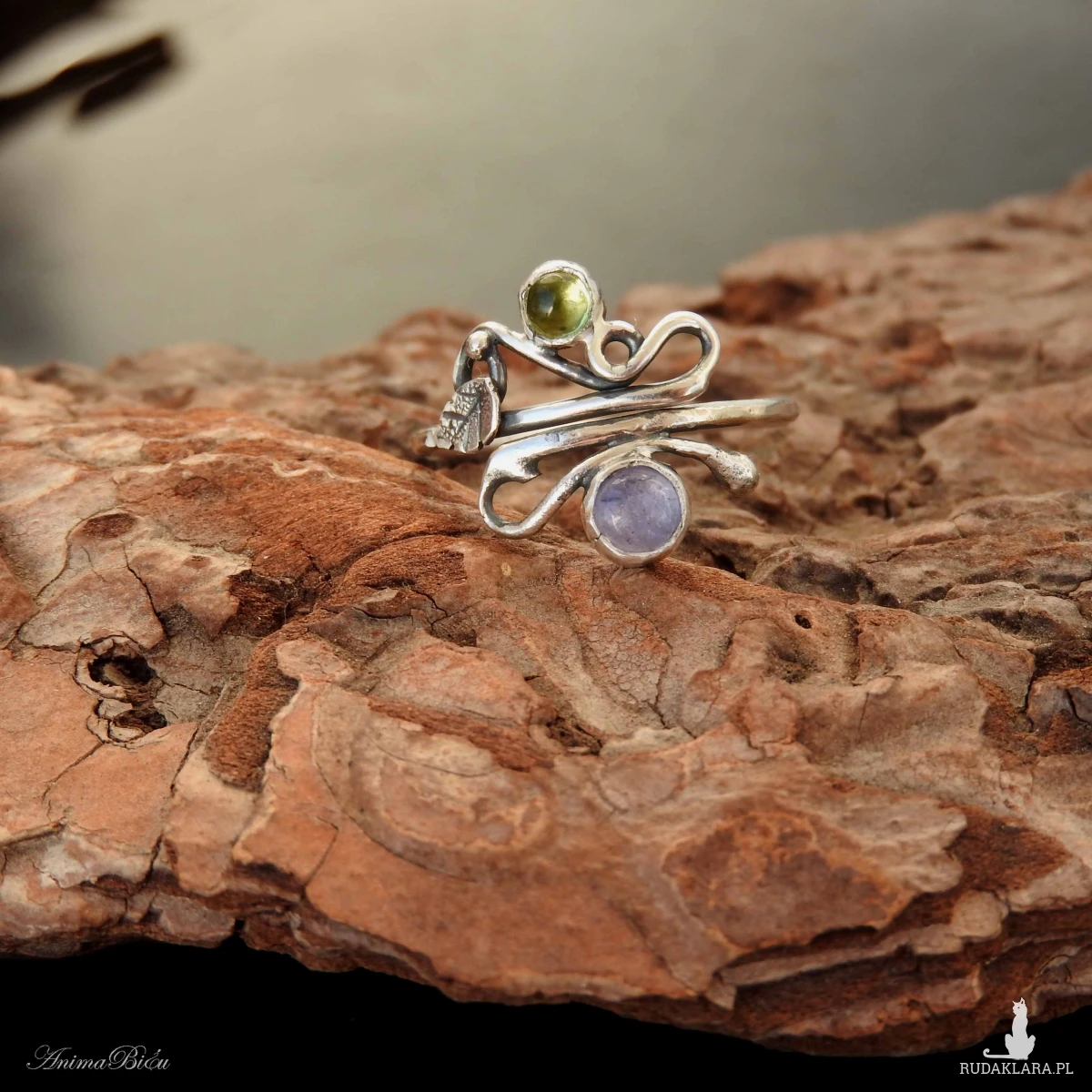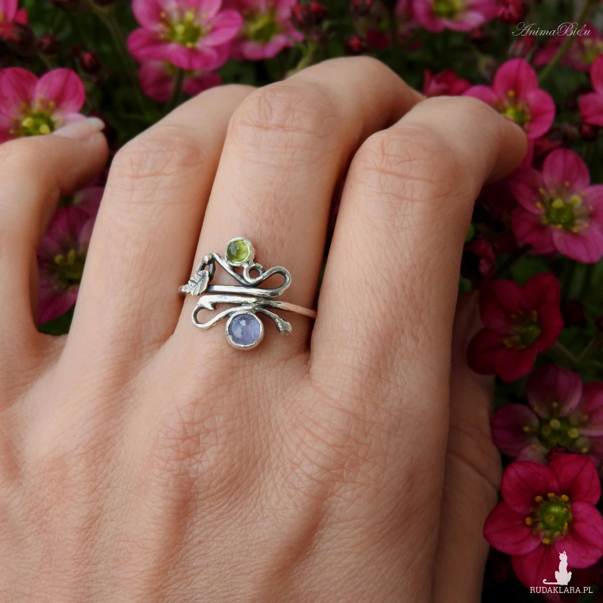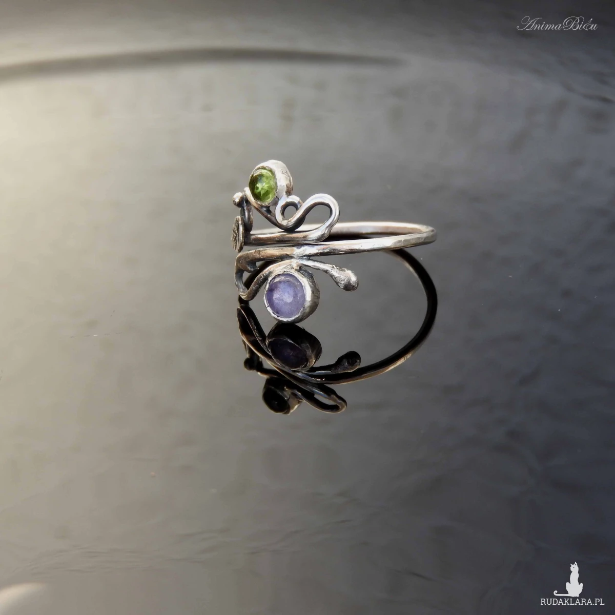 Pierścionek srebrny z oliwinem i tanzanitem. Pierścionek