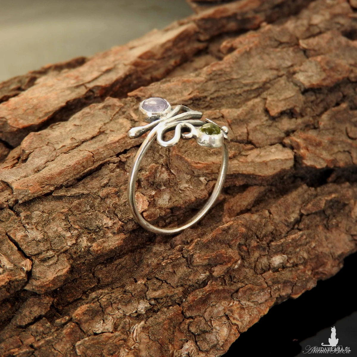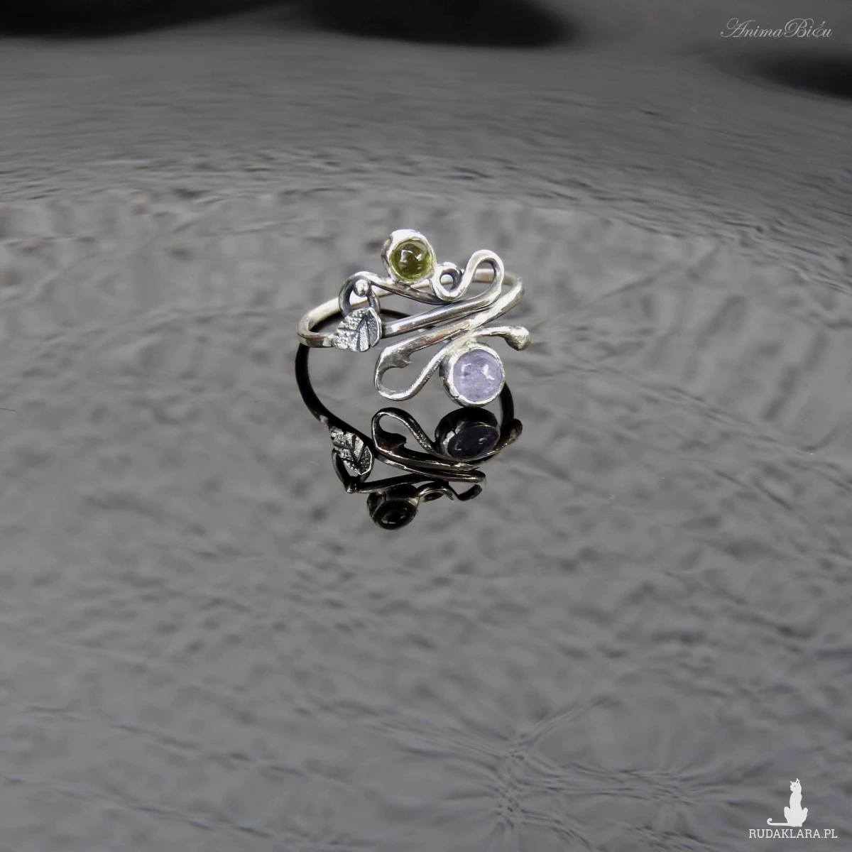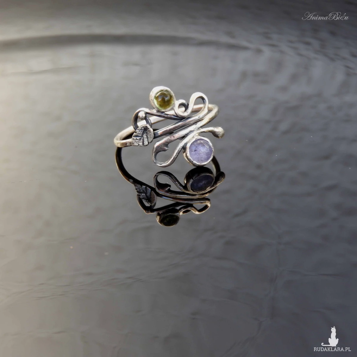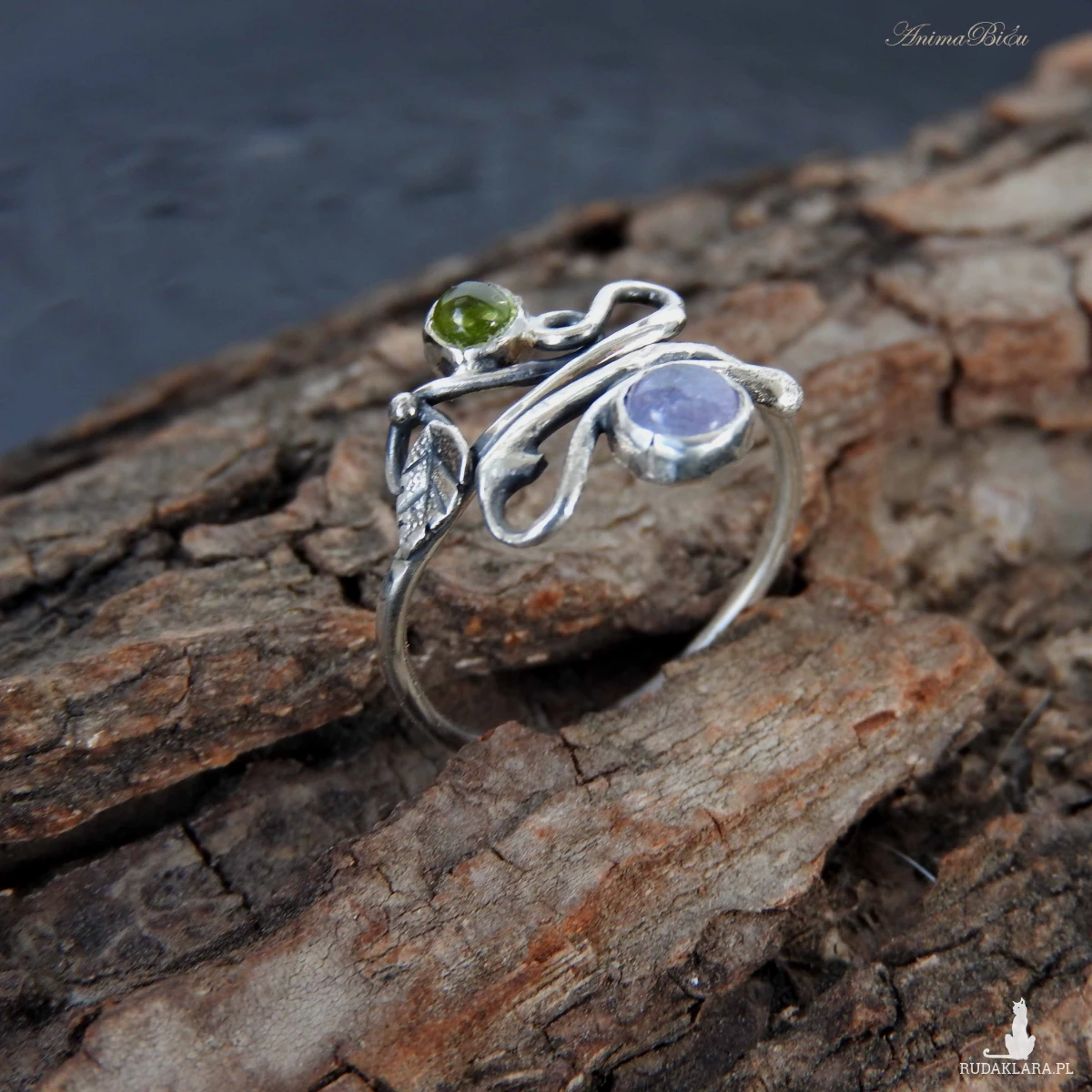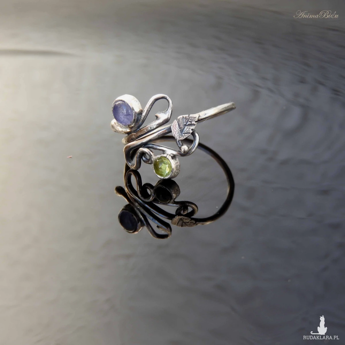 Pierścionek srebrny z oliwinem i tanzanitem. Pierścionek