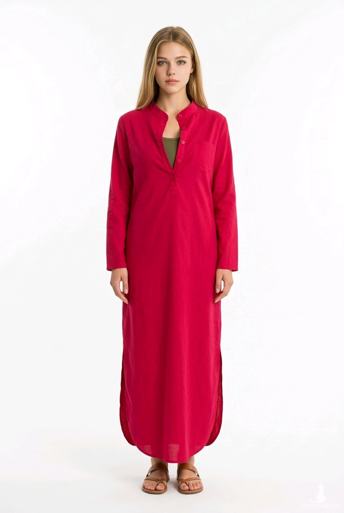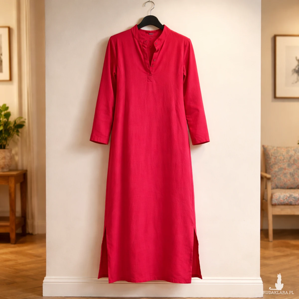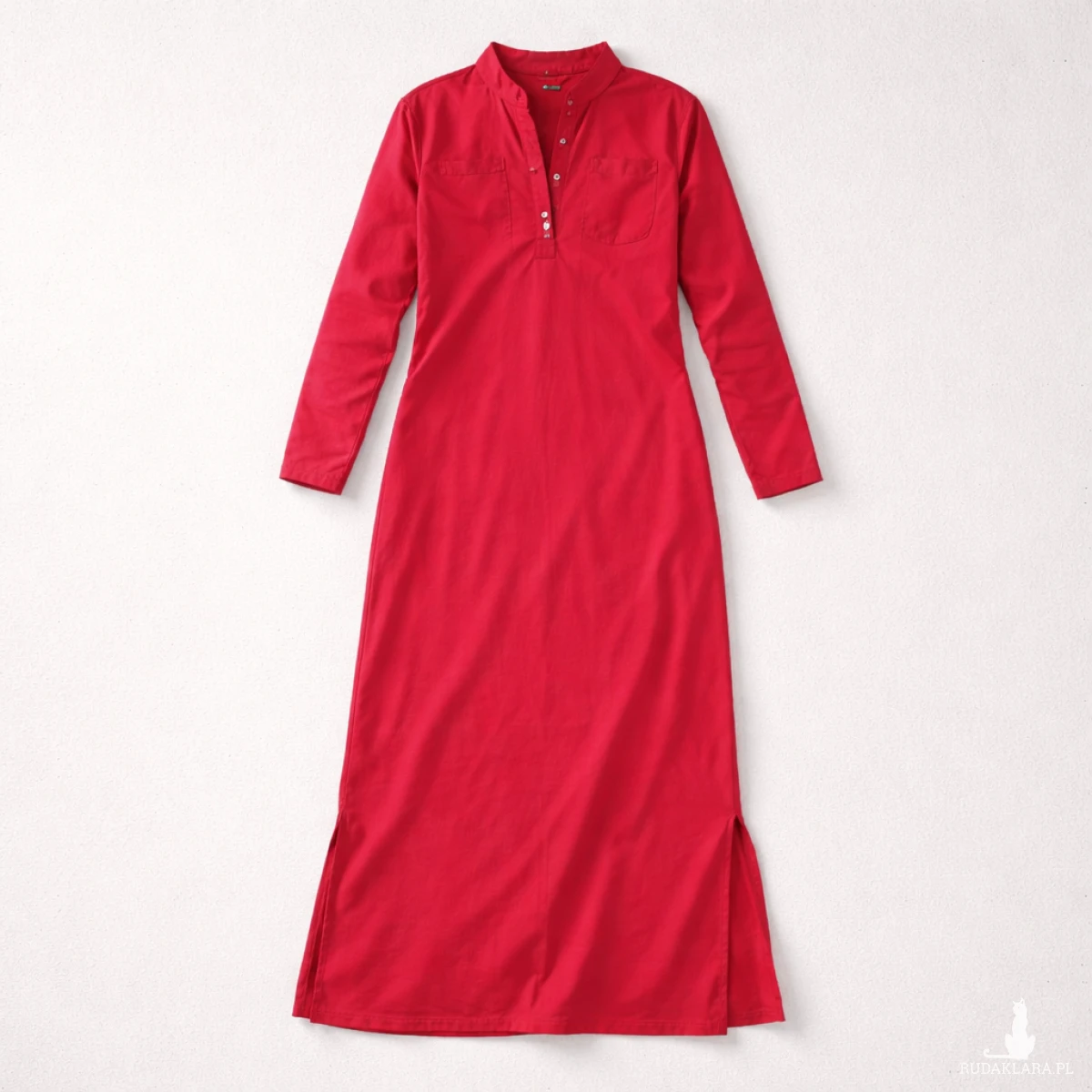 szmizjerka długa sukienka czerwona żorżeta, towar sprowadzany ze wschodu, rozmiar M, materiał to poliester, nylon, bawełna ,nie ma metki żeby sprawdzić w jakim procencie natomiast sukienka wygląda jak uszyta z żorżety materiał letni, przewiewny, sukienka bardzo klasyczna,lekko transparentna, zgrabna szmizjerka, długość całości 134cm, w biuście 94cm, rękaw długi 57cm,, w pasie 98cm, w biodrach 103cm, delikatne rozcięcia po bokach na dole, sukienka klasyczna, bardzo prosta, klasyk, polecam