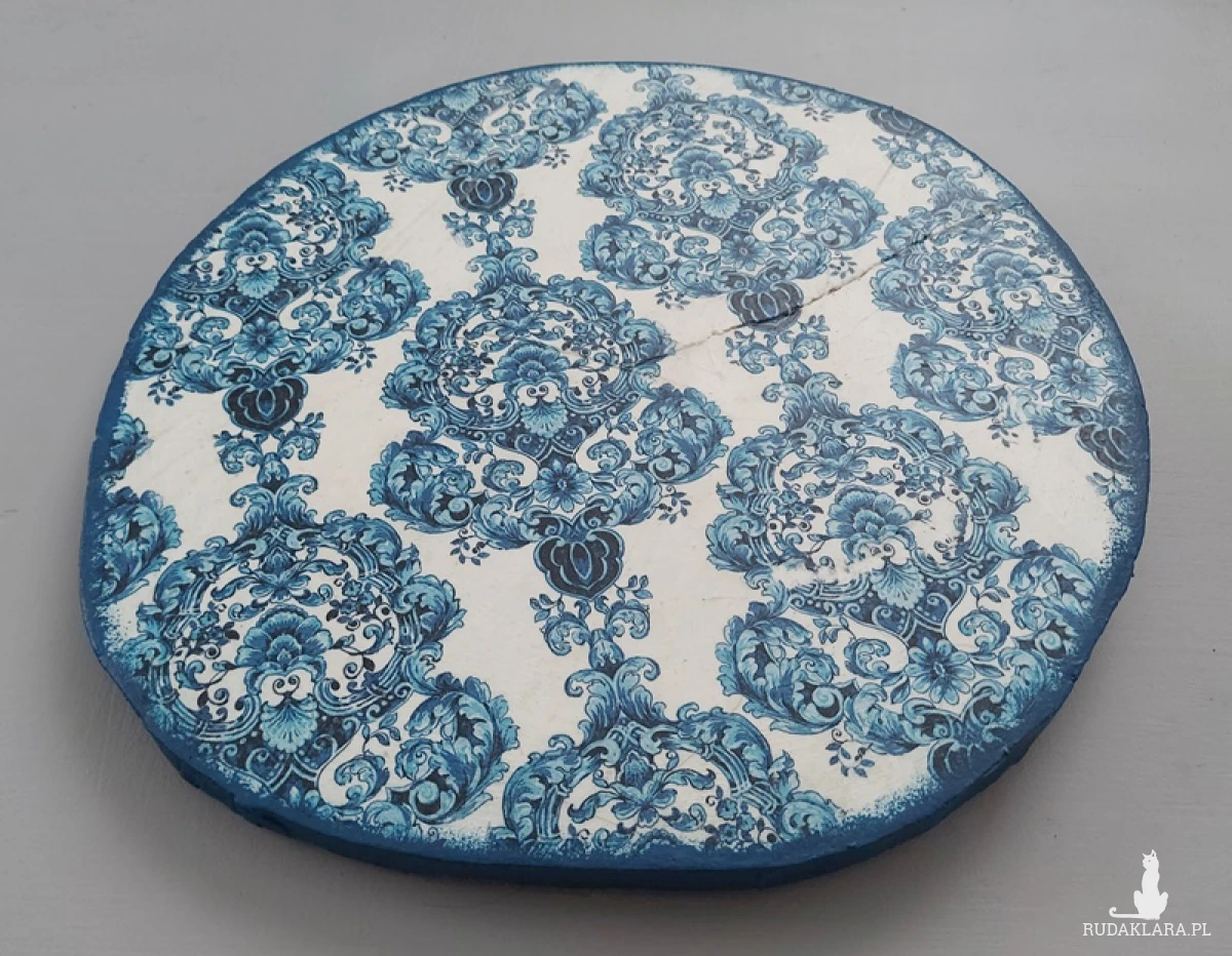 Świece i inne drobiazgi możesz wreszcie zgromadzić na jednej podstawce, a jednocześnie oryginalnej dekoracji. To stary plaster drewna wraz z naturalnymi spękaniami, nierównościami z cięcia oraz przebarwieniami, który został odnowiony w technice decoupage. Średnica ok. 35cm.