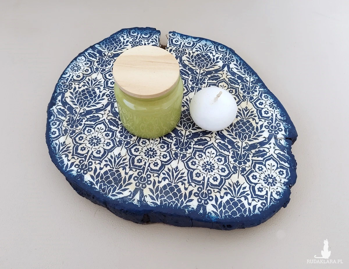Świece i inne drobiazgi możesz wreszcie zgromadzić na jednej podstawce, a jednocześnie oryginalnej dekoracji. To stary plaster drewna wraz z naturalnymi spękaniami, nierównościami z cięcia oraz przebarwieniami, który został odnowiony w technice decoupage. Średnica ok. 23 cm.