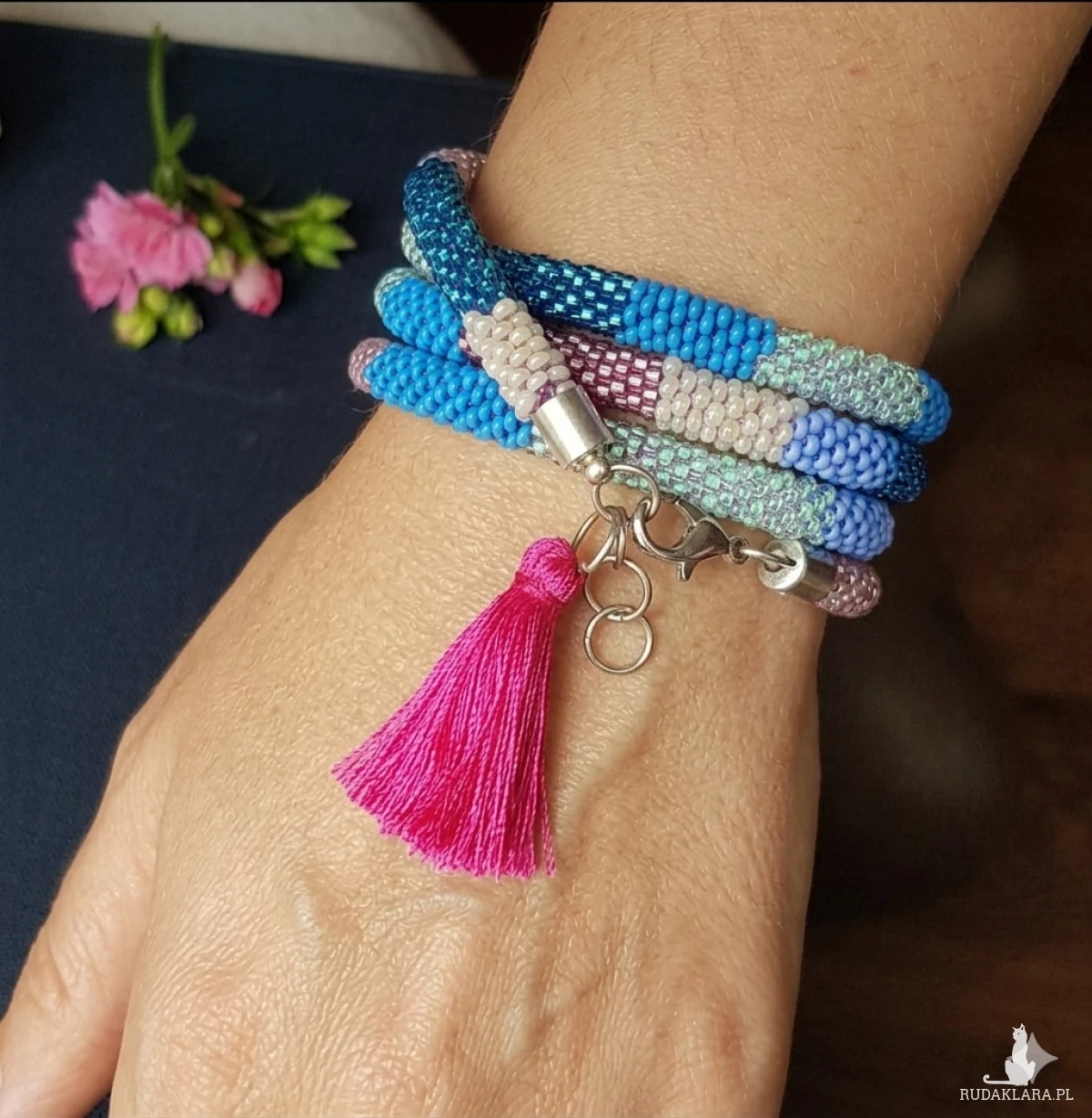 Bransoletka z koralików szklanych czterokrotnie owijana wokół nadgarstka, z amarantowym chwostem, dł całego sznura 70 cm, można nosić jako naszyjnik.