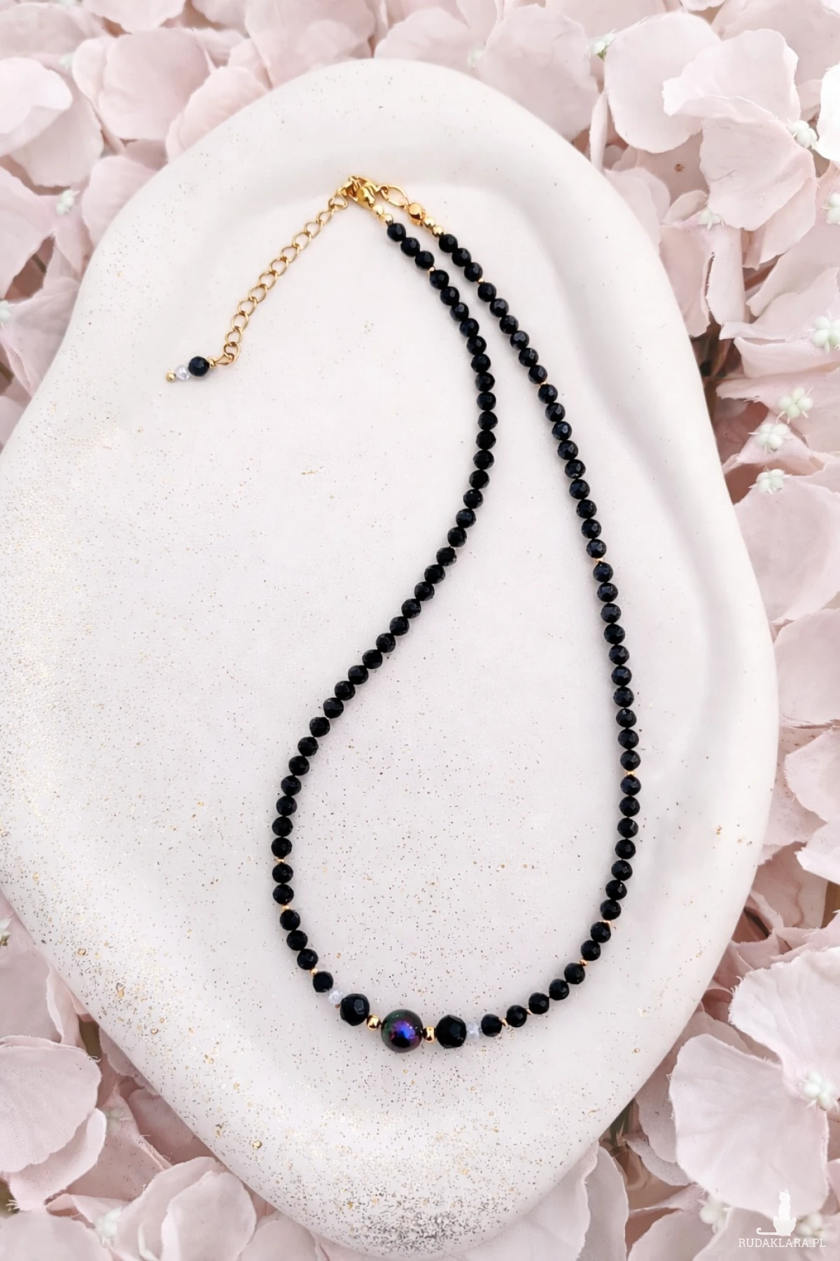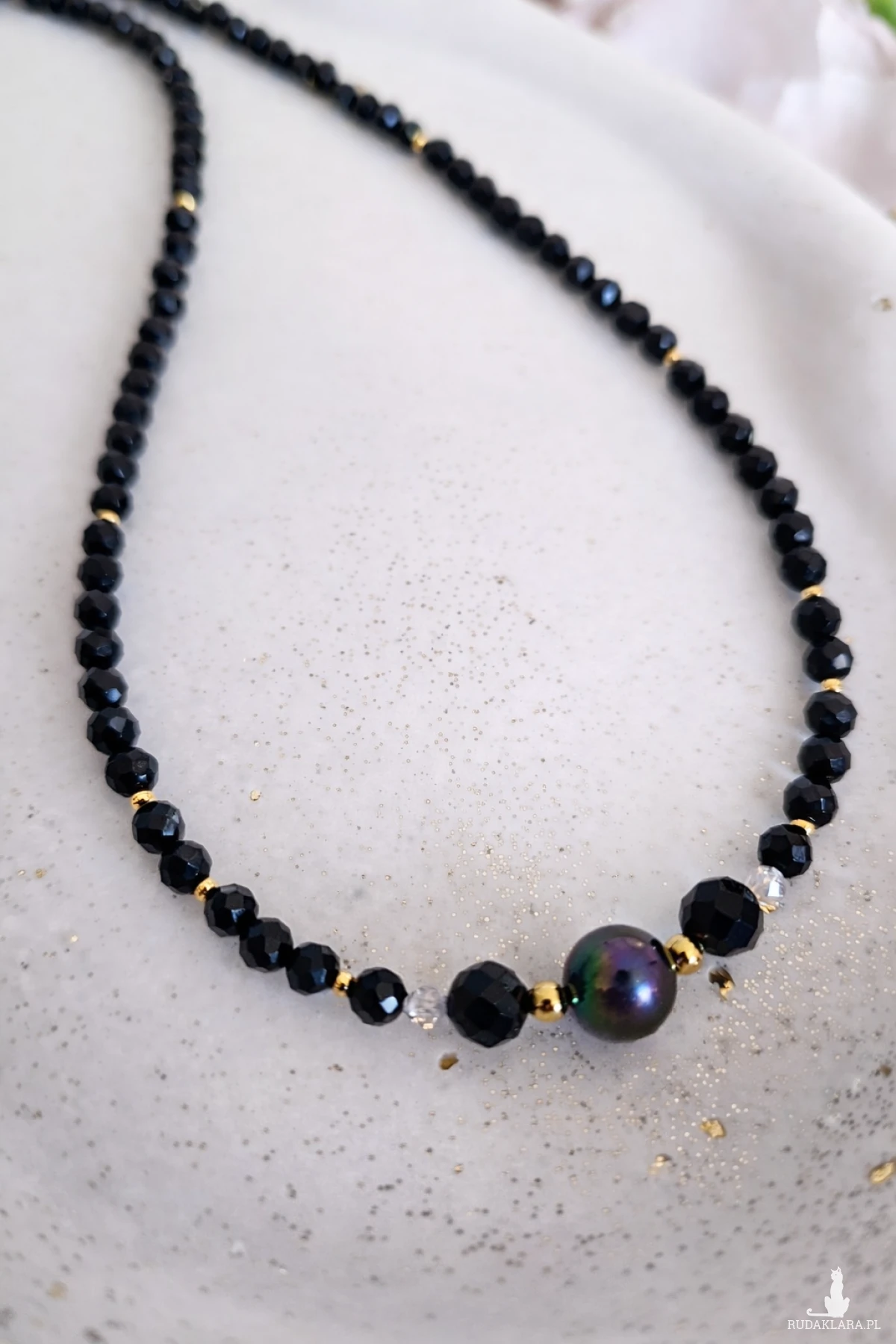 Elegancki naszyjnik stworzony z czarnego turmalinu, czarnej perły oraz cyrkonu, który łączy w sobie tajemniczy blask, ochronną energię i kobiecą elegancję.