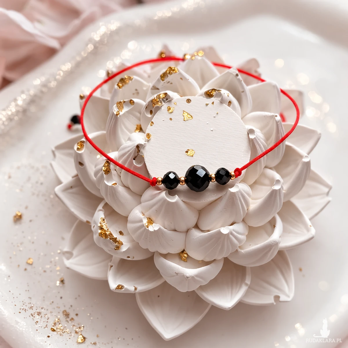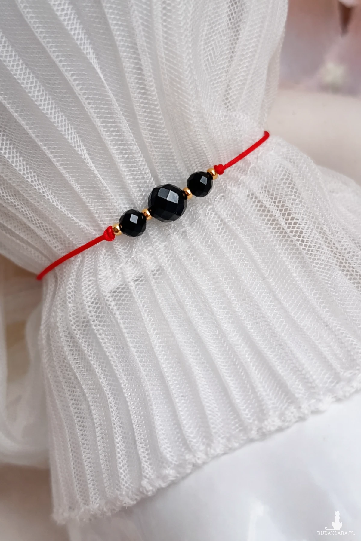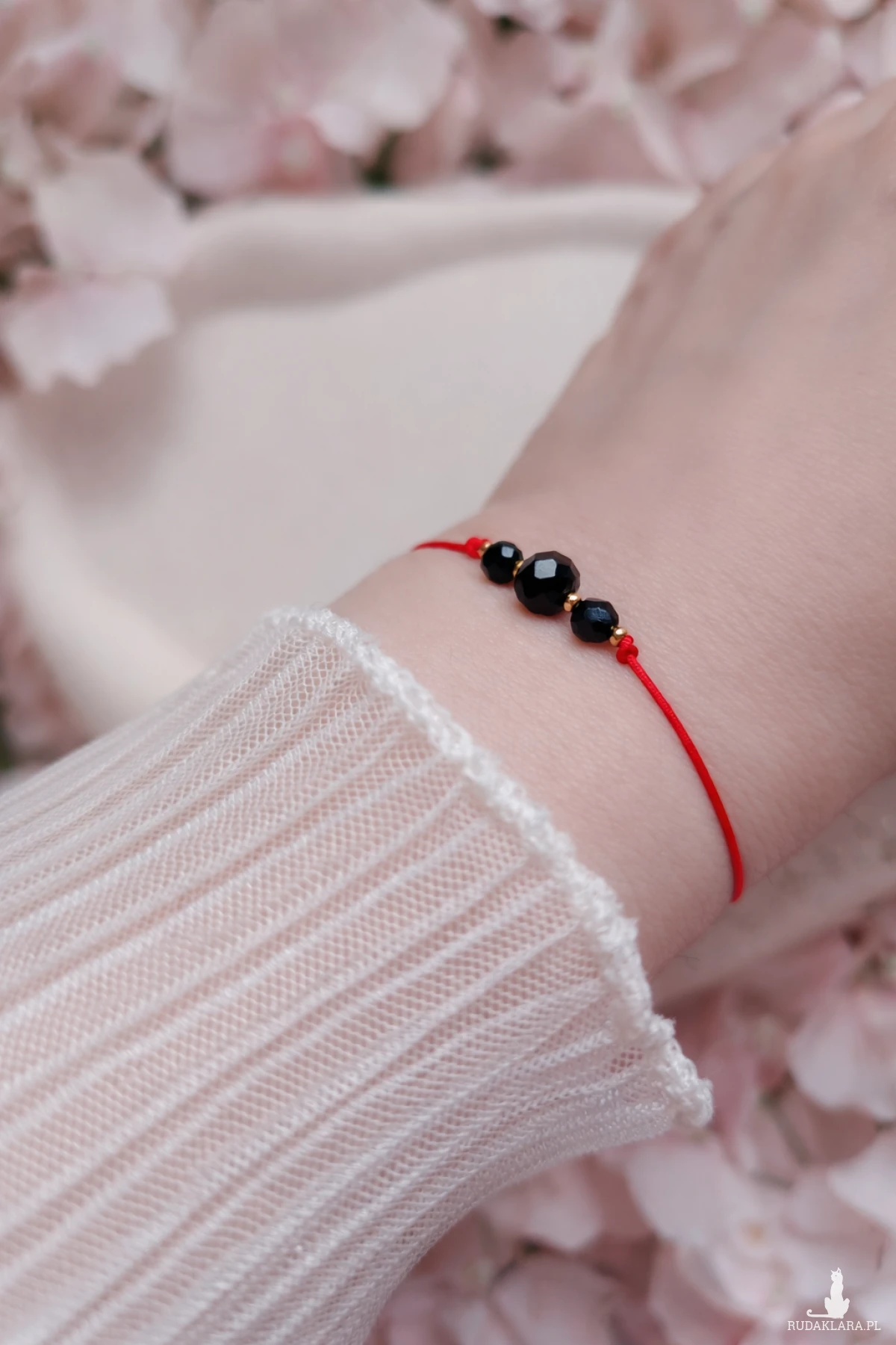 Subtelna, a jednocześnie niezwykle symboliczna bransoletka wykonana na trwałym nylonowym czerwonym sznureczku, ozdobiona fasetowanym czarnym turmalinem oraz drobnymi kuleczkami ze stali chirurgicznej wysokiej jakości z powłoką odporną na ścieranie. Minimalistyczna forma sprawia, że jest lekka, wygodna i idealna do codziennego noszenia.