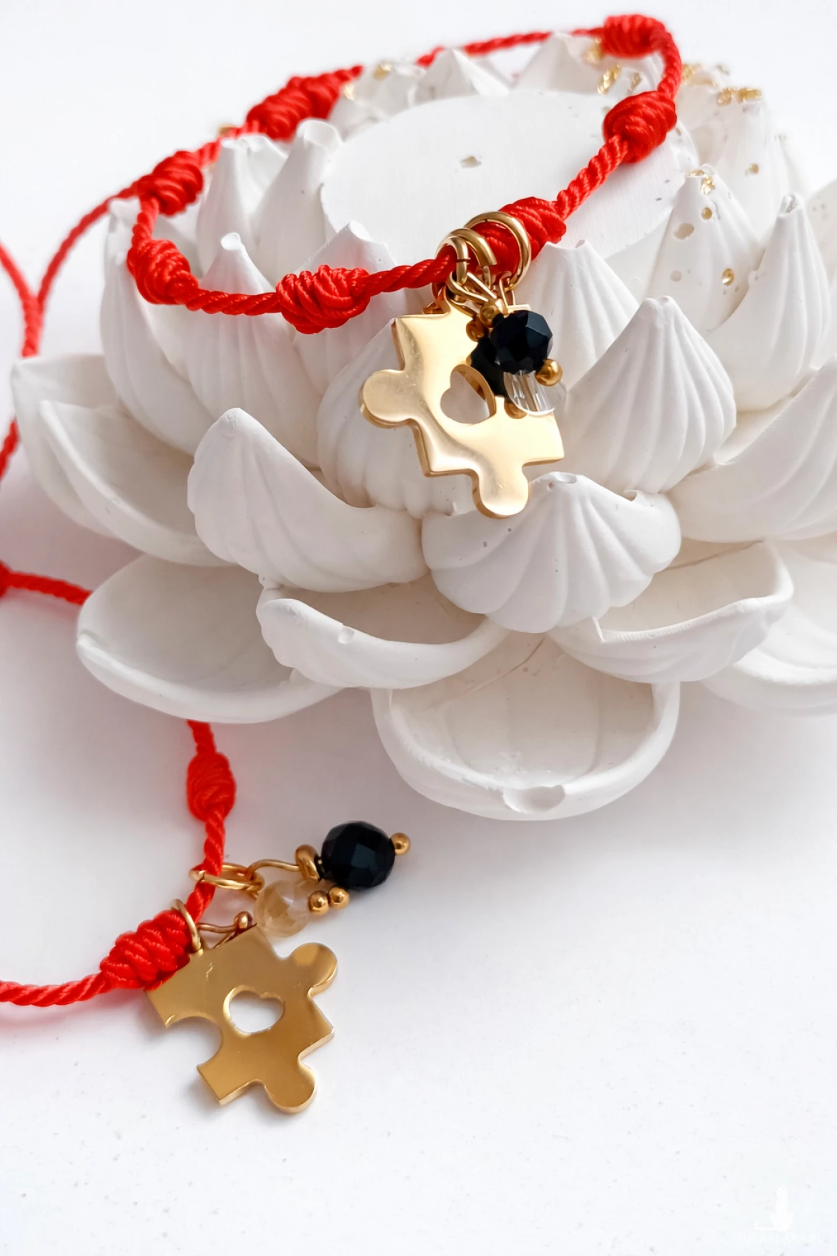 Centralnym symbolem zestawu są zawieszki w kształcie puzzli z sercem, które idealnie się uzupełniają. To piękna metafora dwóch historii, które łączą się w jedną – dwóch energii, które razem tworzą harmonię.