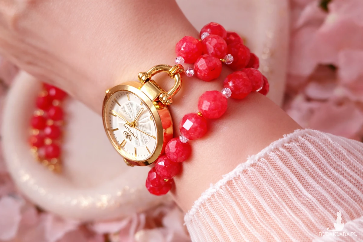Wyjątkowa bransoletka wykonana z ciosanego rodochrozytu w pięknym malinowo-różowym odcieniu. Fasetowane kamienie subtelnie odbijają światło, dzięki czemu bransoletka delikatnie błyszczy i przyciąga wzrok.