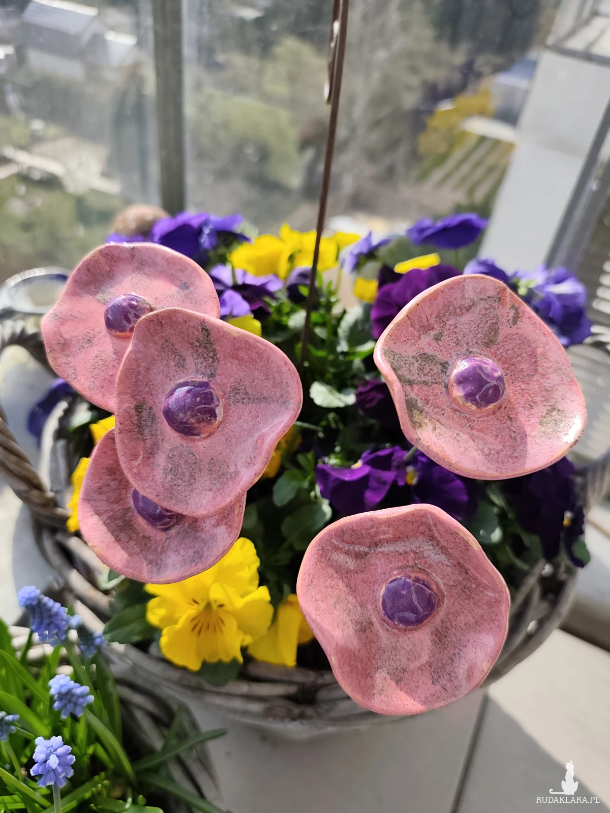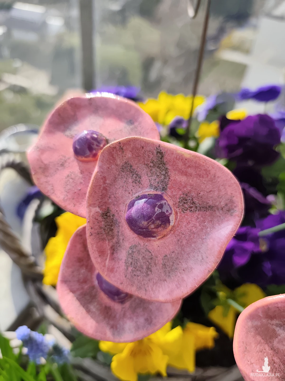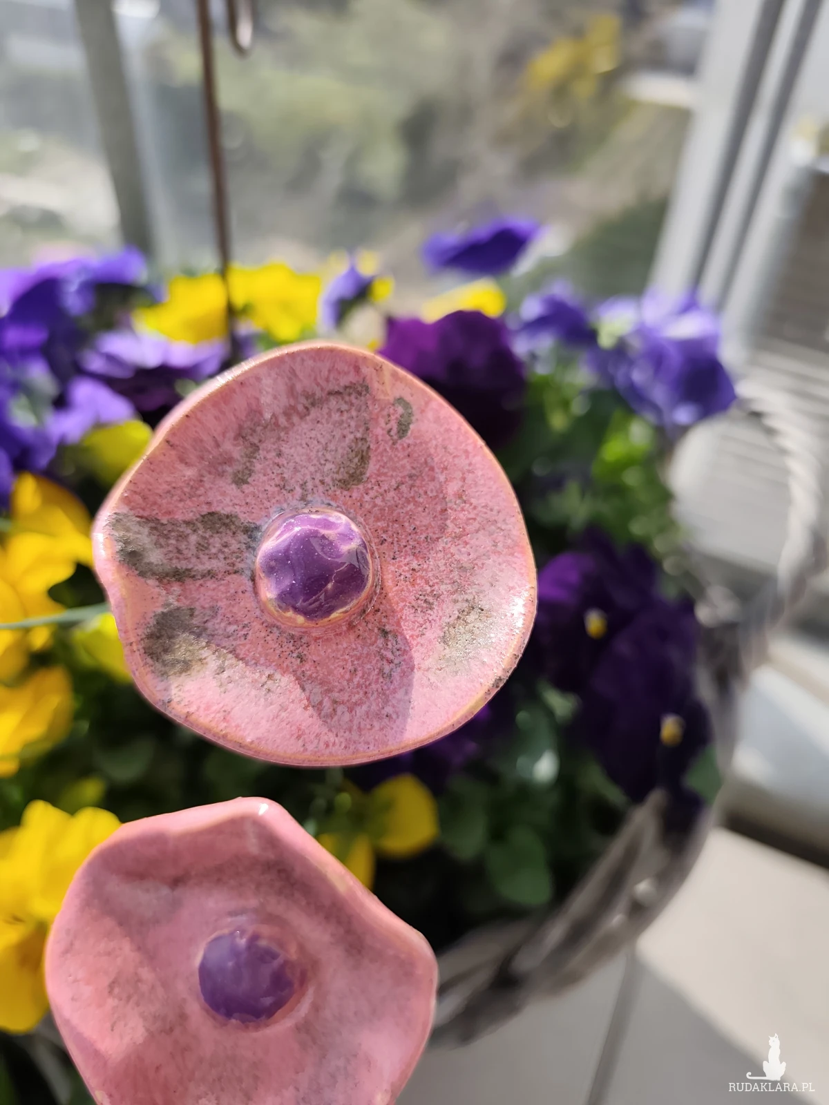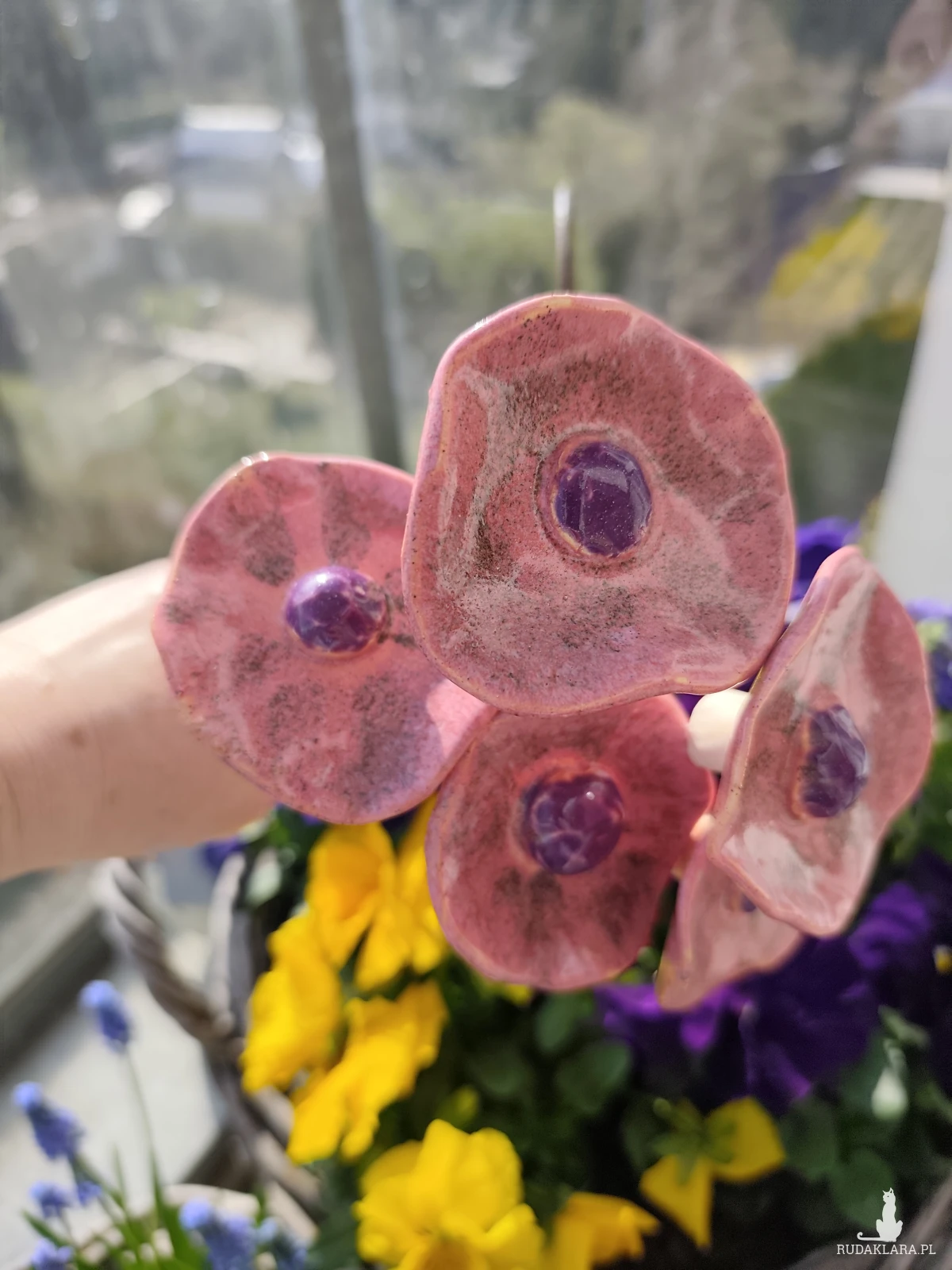 Kwiaty ceramiczne 5 szt, wykonane ręcznie z gliny szamotowej, szkliwione i dwukrotnie wypalane w piecu ceramicznym na 1050 stopni. Polecam do domu, na balkon lub do ogrodu. Średnica około 6 cm. Nie przekwitają :)