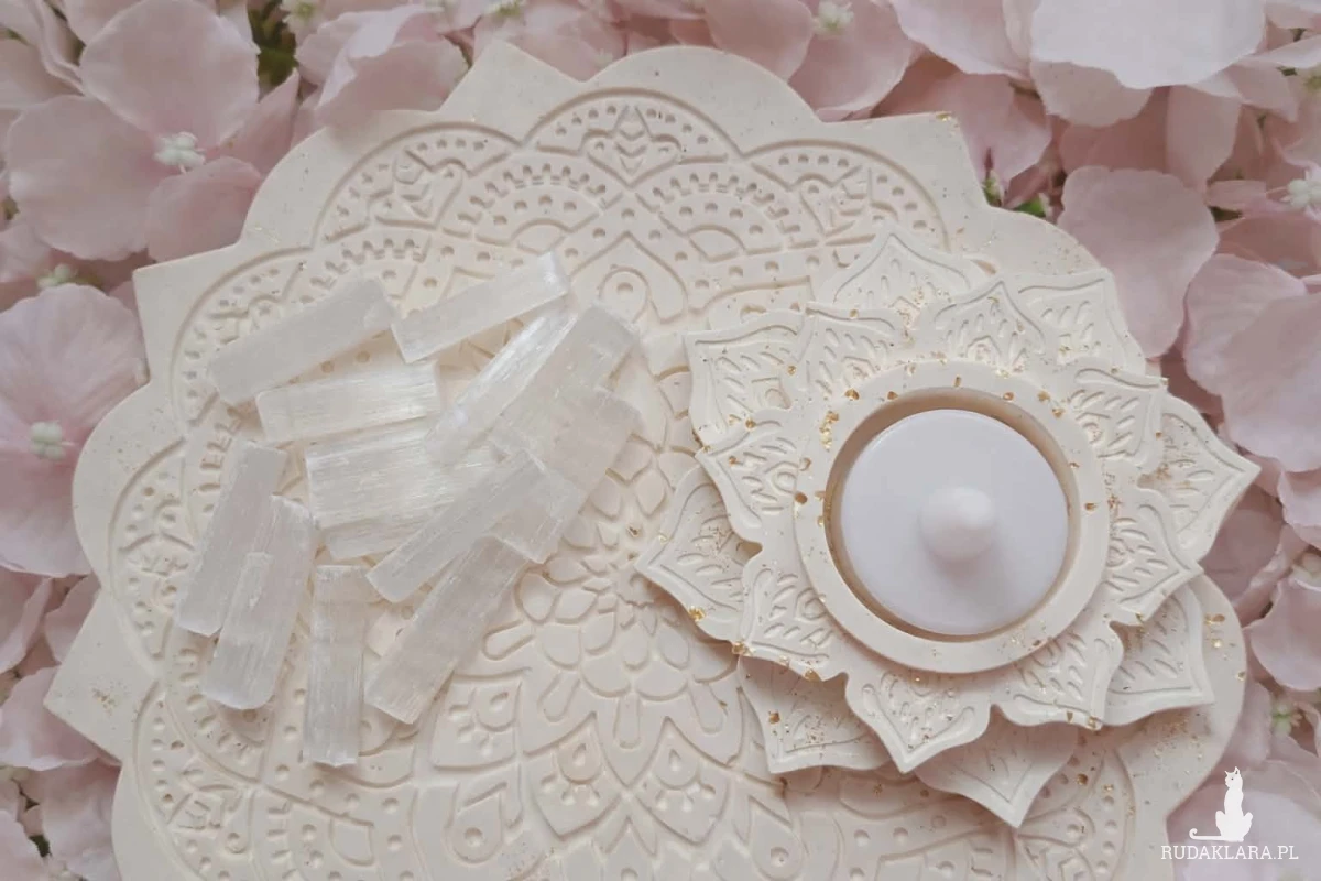 Podstawki wykonane są z gipsu polimerowego z subtelnymi złotymi zdobieniami, które nadają całości elegancki, wyjątkowy charakter. Mandala od wieków jest symbolem harmonii, równowagi i wewnętrznego porządku. Jej symetryczna forma przypomina o naturalnym rytmie życia i energii wszechświata. Uważa się, że mandala pomaga wprowadzić spokój, wyciszenie i równowagę energetyczną. W przestrzeni duchowej traktowana jest jako symbol ochrony, harmonizacji energii oraz powrotu do własnego centrum. Selenit „Anielskie Skrzydło” Selenit nazywany jest często kamieniem światła lub anielskim skrzydłem. Jego delikatna, mleczna struktura przypomina skrzydła aniołów i symbolizuje czystość, ochronę oraz wysoką wibrację. Jest to jeden z niewielu minerałów, który naturalnie oczyszcza energię innych kamieni. Pomaga usuwać nagromadzoną energię z biżuterii i talizmanów, przywracając im równowagę oraz naturalną moc. Selenit: oczyszcza i harmonizuje energię kamieni wzmacnia działanie biżuterii energetycznej wprowadza spokój i delikatną, wysoką wibrację do przestrzeni. Jak korzystać z zestawu Połóż swoją biżuterię, kamienie lub talizmany na mandali obok bryłek selenitu. Możesz zapalić świeczkę tea light w podstawce mandali, aby wzmocnić proces oczyszczania i stworzyć spokojną, harmonijną przestrzeń. Zestaw może być również pięknym elementem dekoracyjnym – na toaletce, biurku lub w miejscu Twoich codziennych rytuałów. Wymiary podstawki mandala: około 20 cm.
