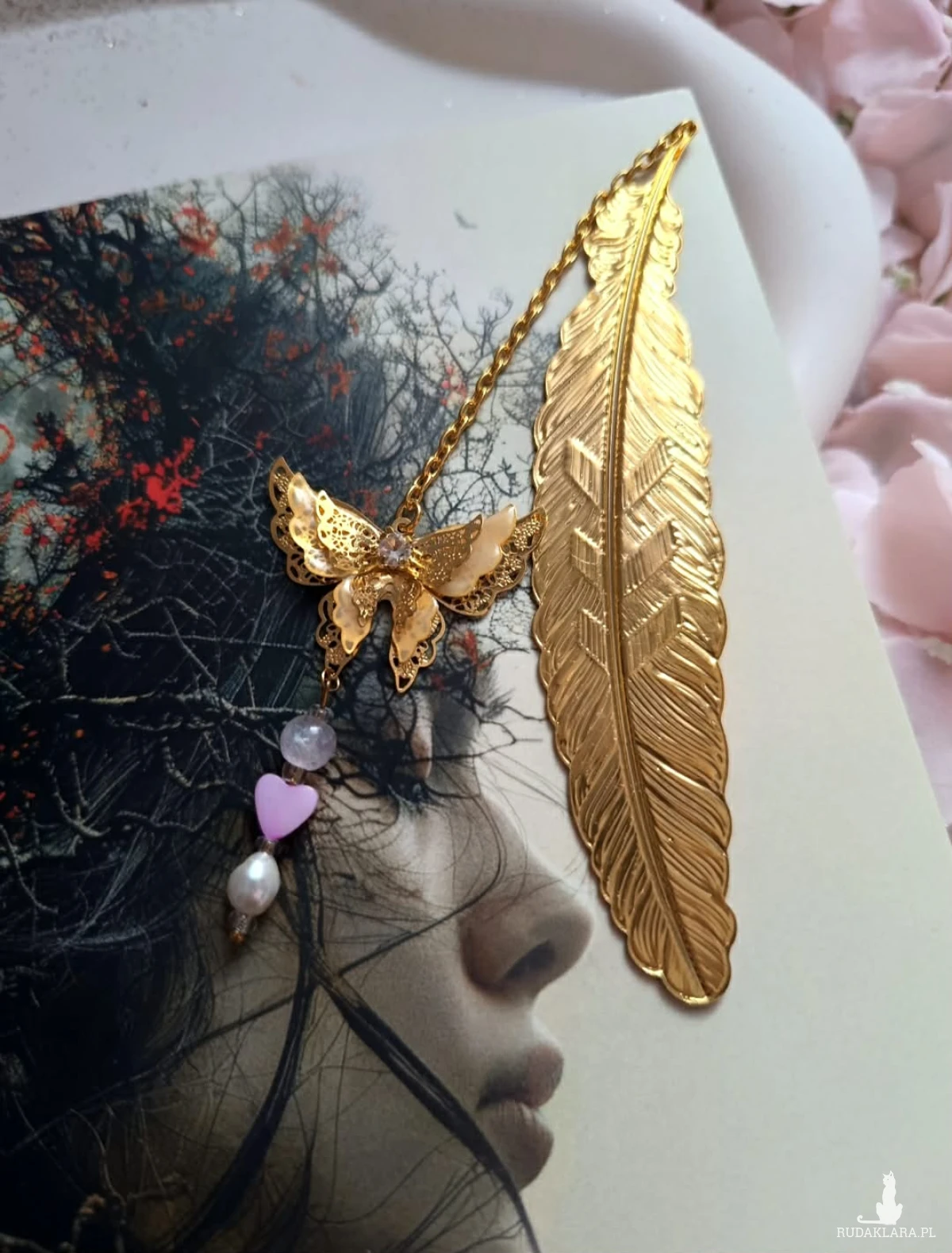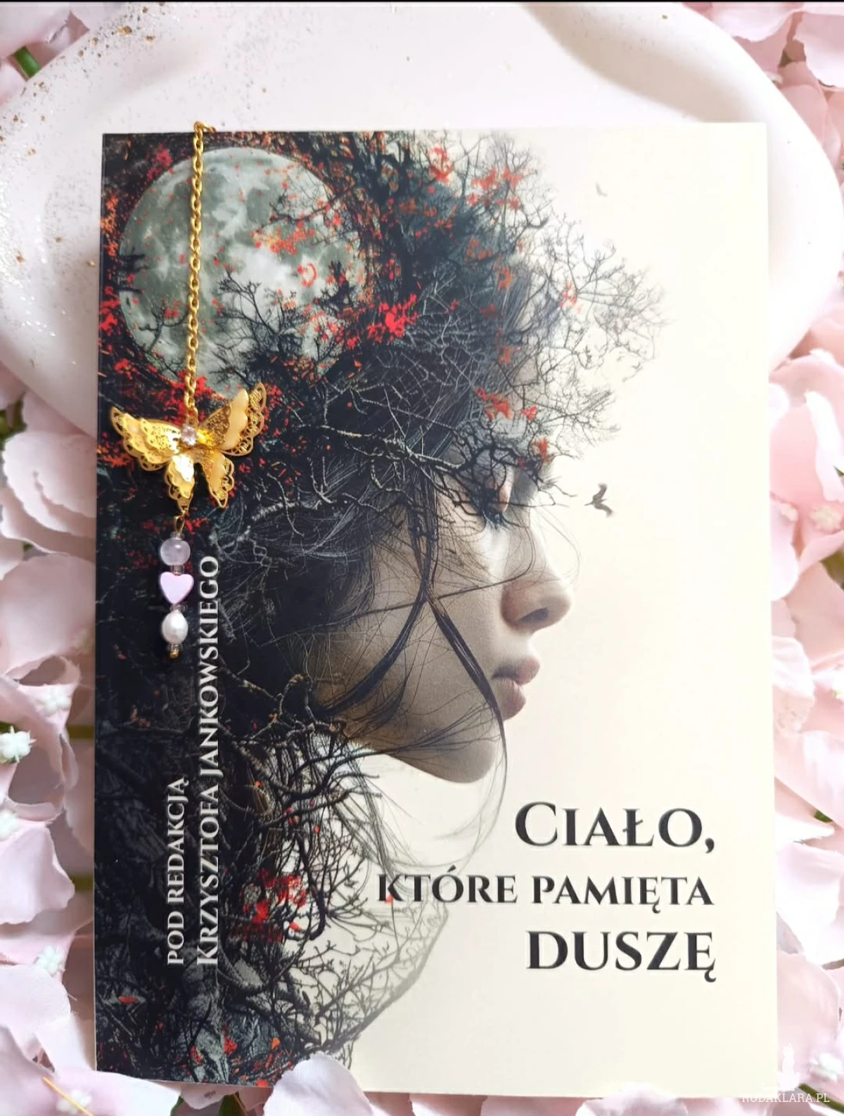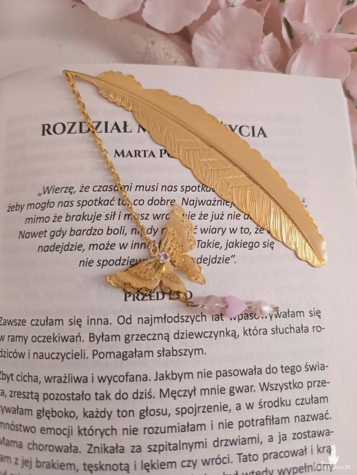 Do książki otrzymasz wyjątkową, metalową zakładkę w kształcie pióra. Zakończona delikatnym motylem – symbolem przemiany i wewnętrznej wolności. Wykonana w złotym kolorze, ozdobiona kamieniami naturalnymi: kwarcem różowym, masą perłową oraz naturalną perłą. Każdy z tych elementów niesie ze sobą energię łagodności, kobiecości i miłości do siebie. To nie tylko praktyczny dodatek ale subtelny talizman, który będzie towarzyszył Ci podczas tej wyjątkowej podróży.
