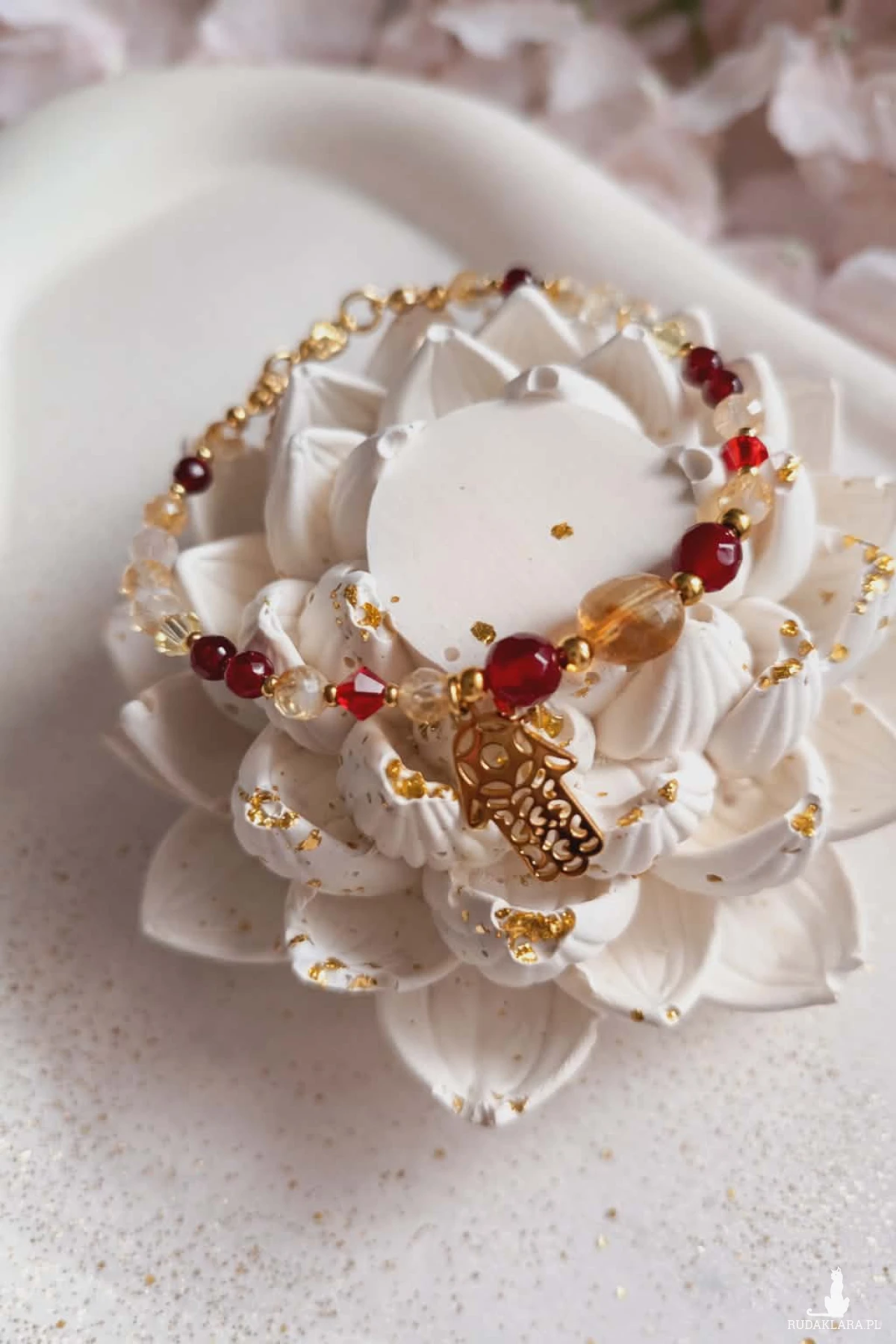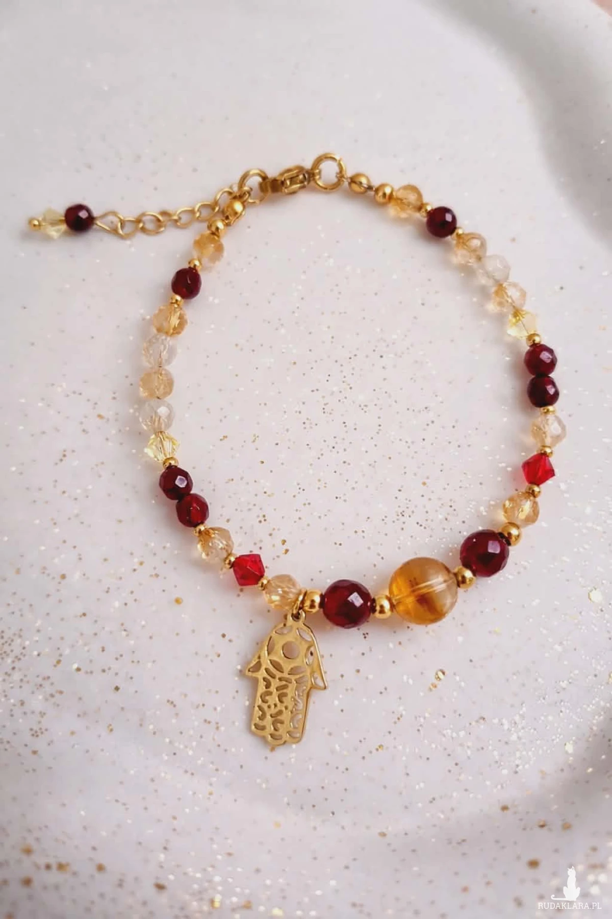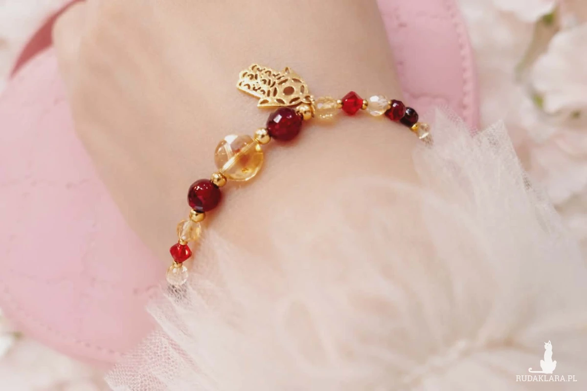 Wykonana na trwałej lince jubilerskiej, łączy w sobie głębię granatu, słoneczne światło cytrynu oraz subtelny blask kryształów Swarovski. Całość dopełnia zawieszka Hamsa – symbol ochrony i dobrej energii. To coś więcej niż biżuteria. To amulet, który otula Cię swoją energią i towarzyszy każdego dnia.