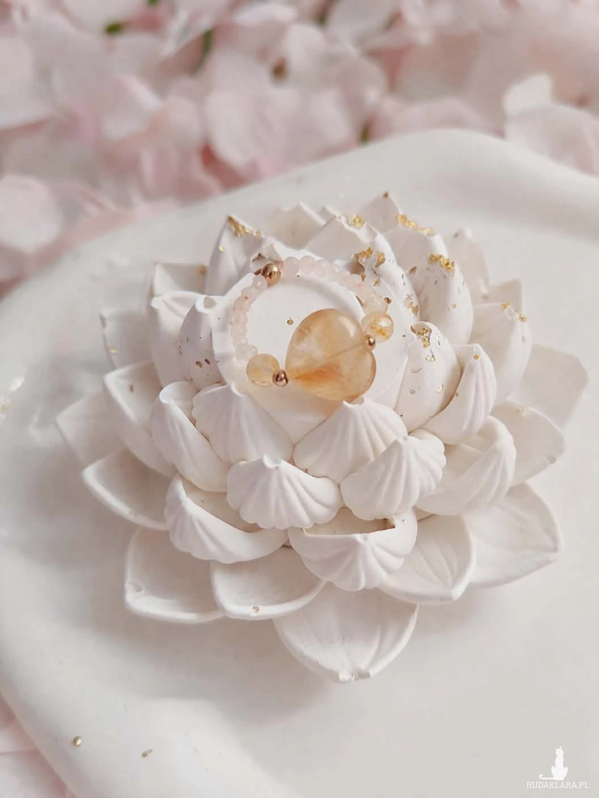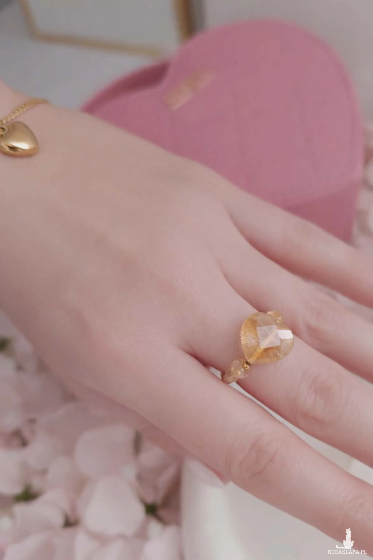 Pierścionek wykonany na elastycznej gumce jubilerskiej, dzięki czemu dopasowuje się do palca (do rozmiaru 17) i jest wygodny w codziennym noszeniu. Stworzony z naturalnych cytrynów – w centrum znajduje się większe, fasetowane serce, które pięknie odbija światło i nadaje całości ciepły, złocisty blask. Uzupełnieniem są mniejsze, również fasetowane kamienie, które dodają lekkości i subtelnej elegancji.