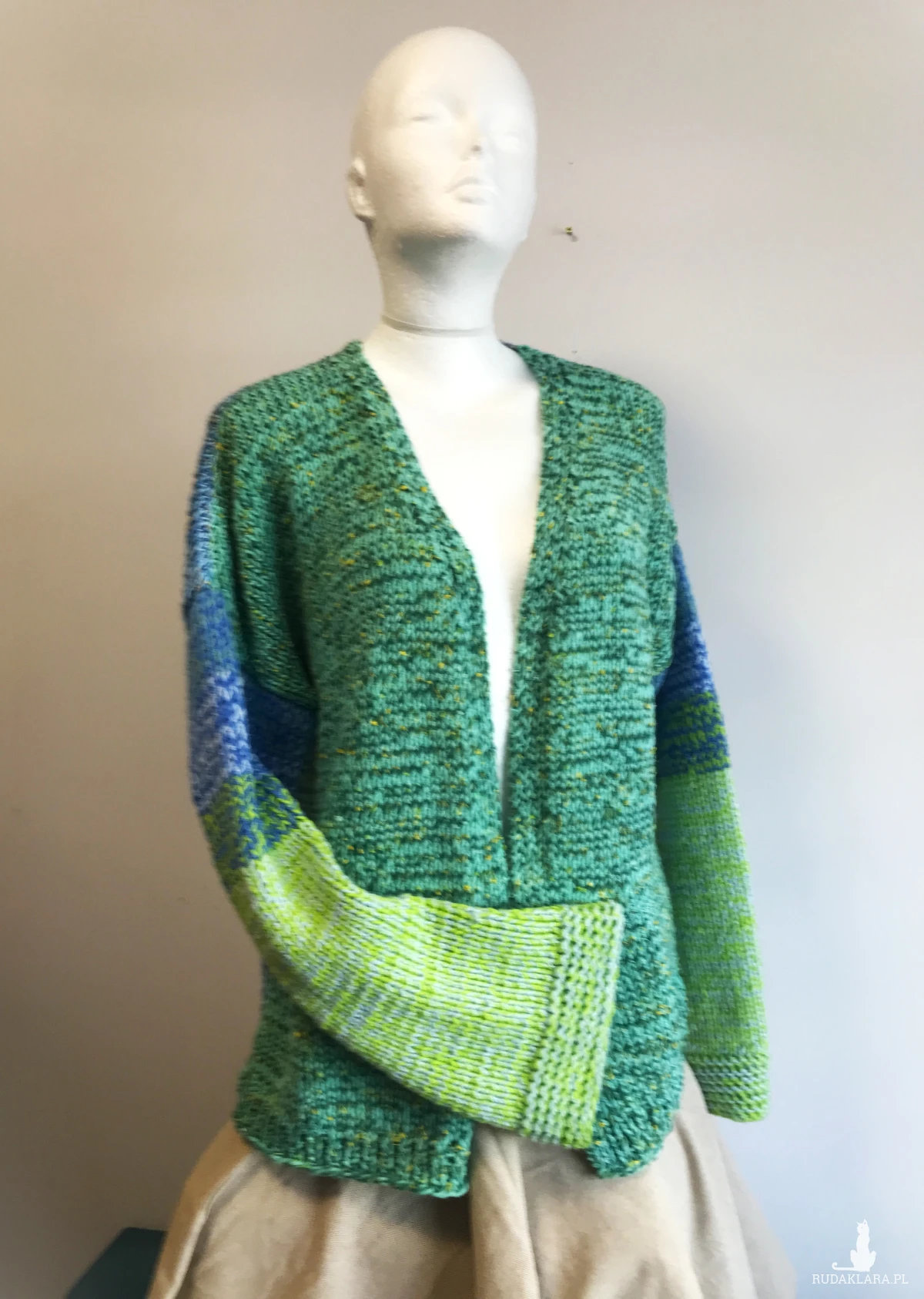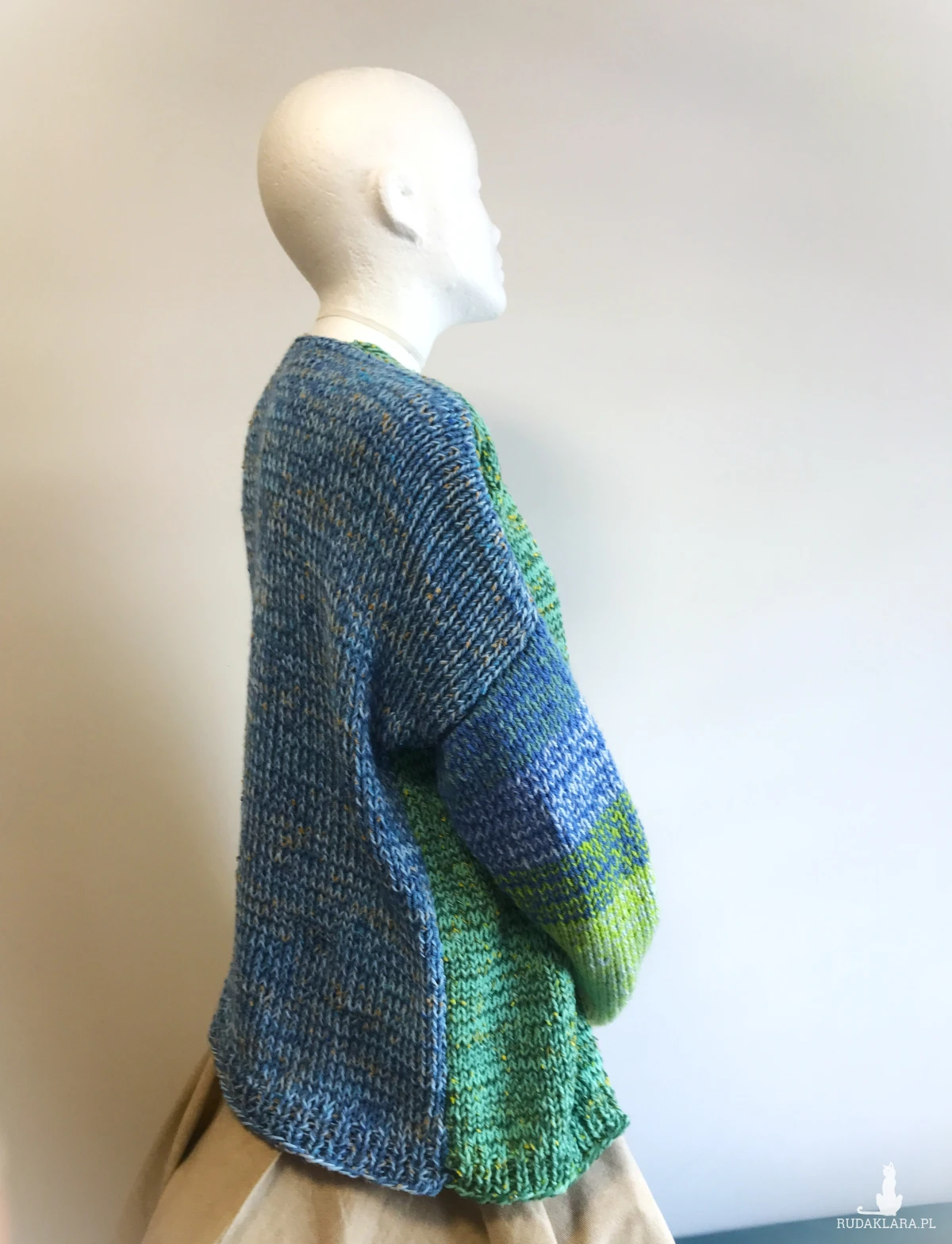 Kolorowy kardigan wykonany z podwójnej miękkiej włóczki akrylowej. Rozmiar uniwersalny; dla osób o rozmiarze 36 będzie nieco obszerny, co nada stylizacji ciekawy charakter. Może stanowić ciekawą propozycję bądź uzupełnienie wiosennych stylizacji.