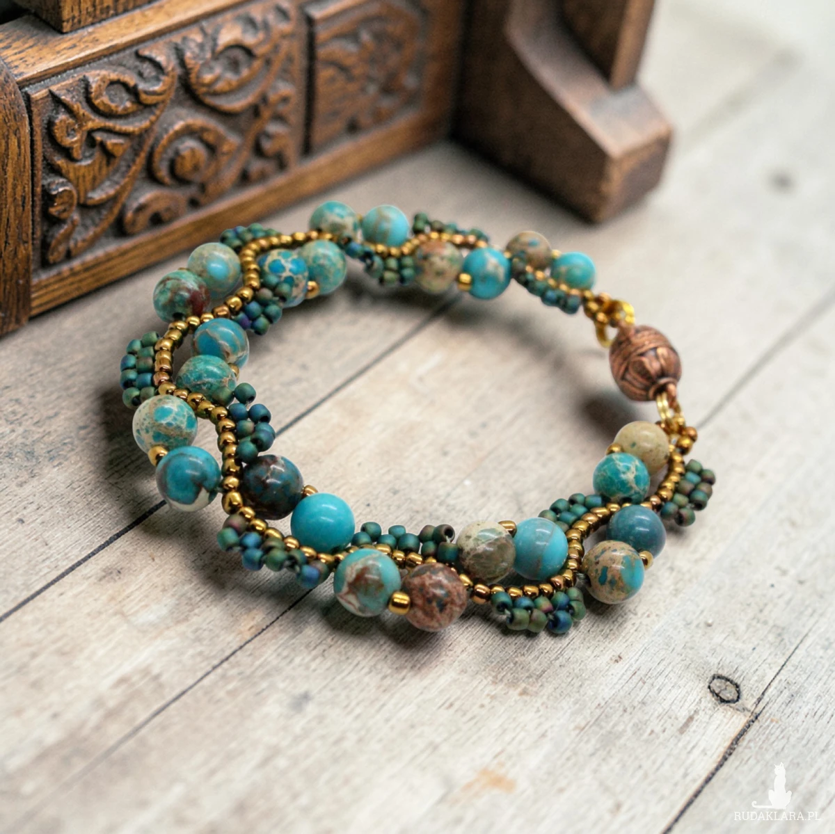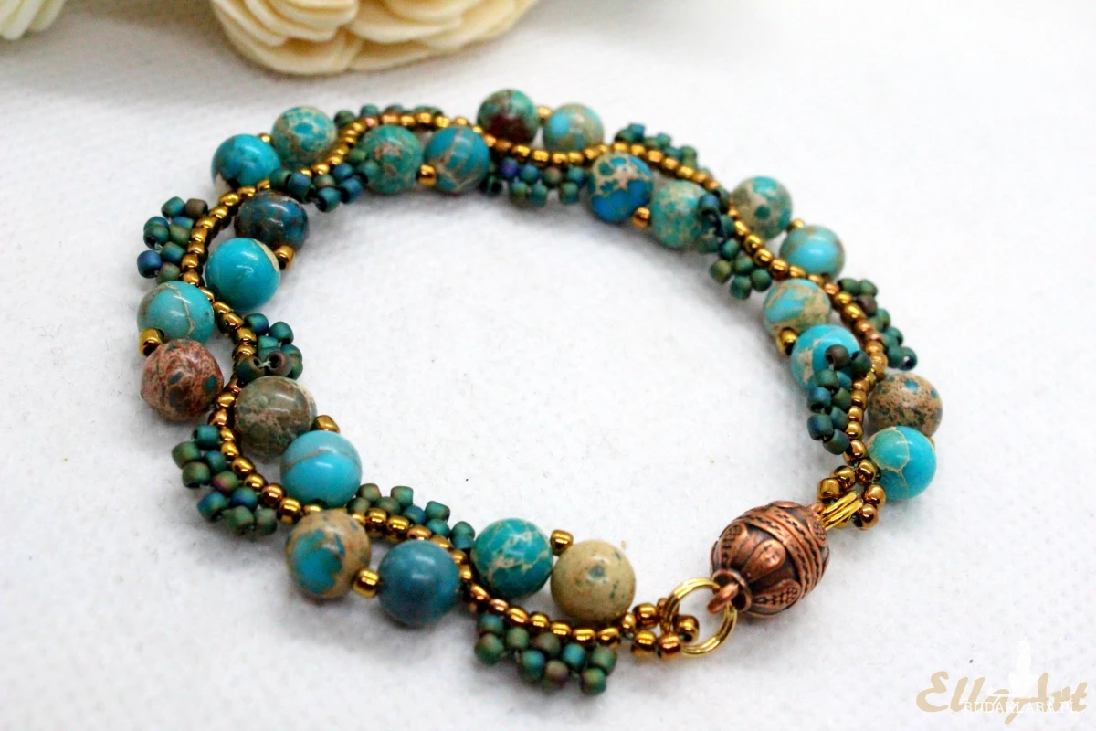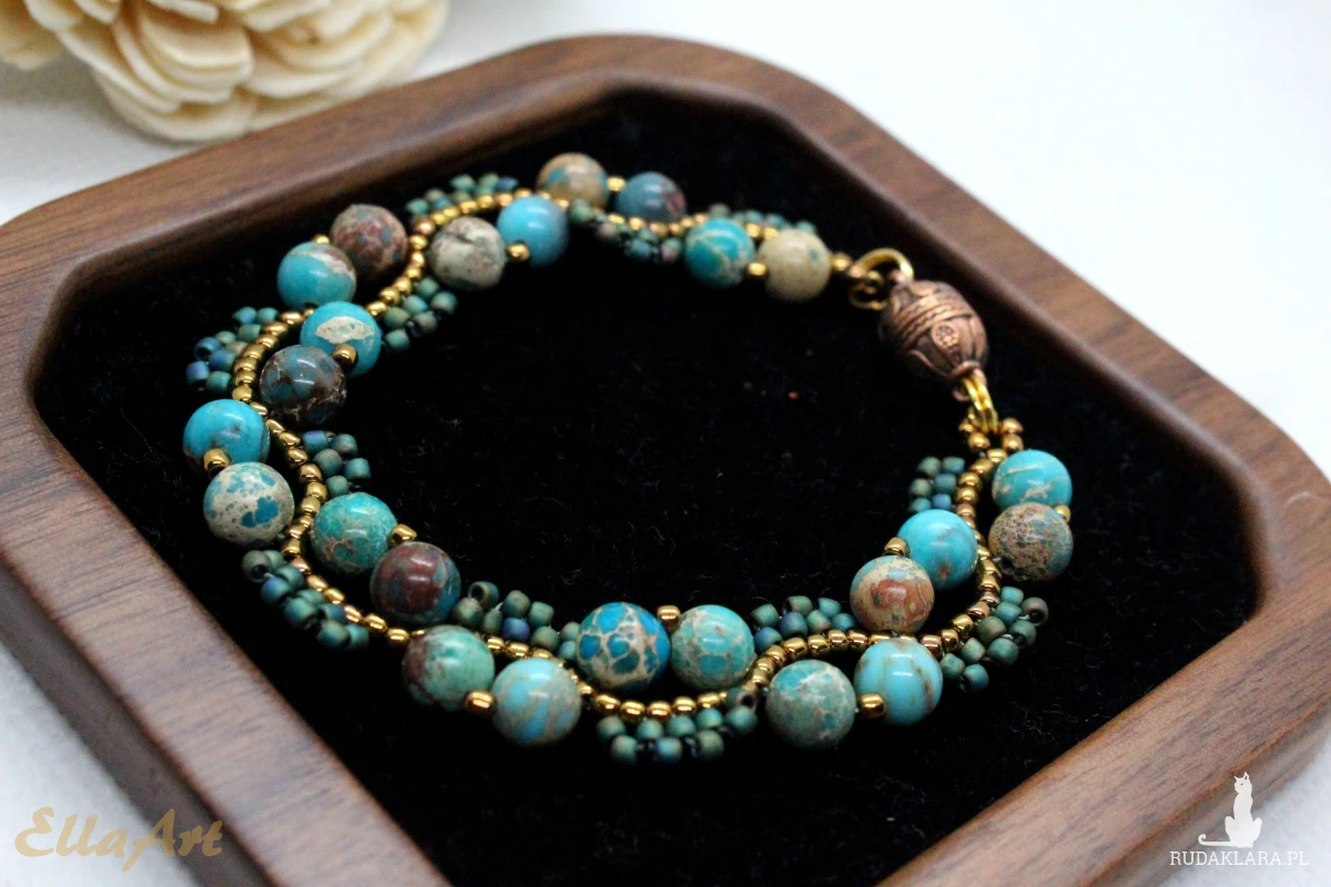 Bransoletka uszyta z kamieni naturalnych jaspisu oraz drobniutkich, szklanych koralików japońskiej firmy Toho.