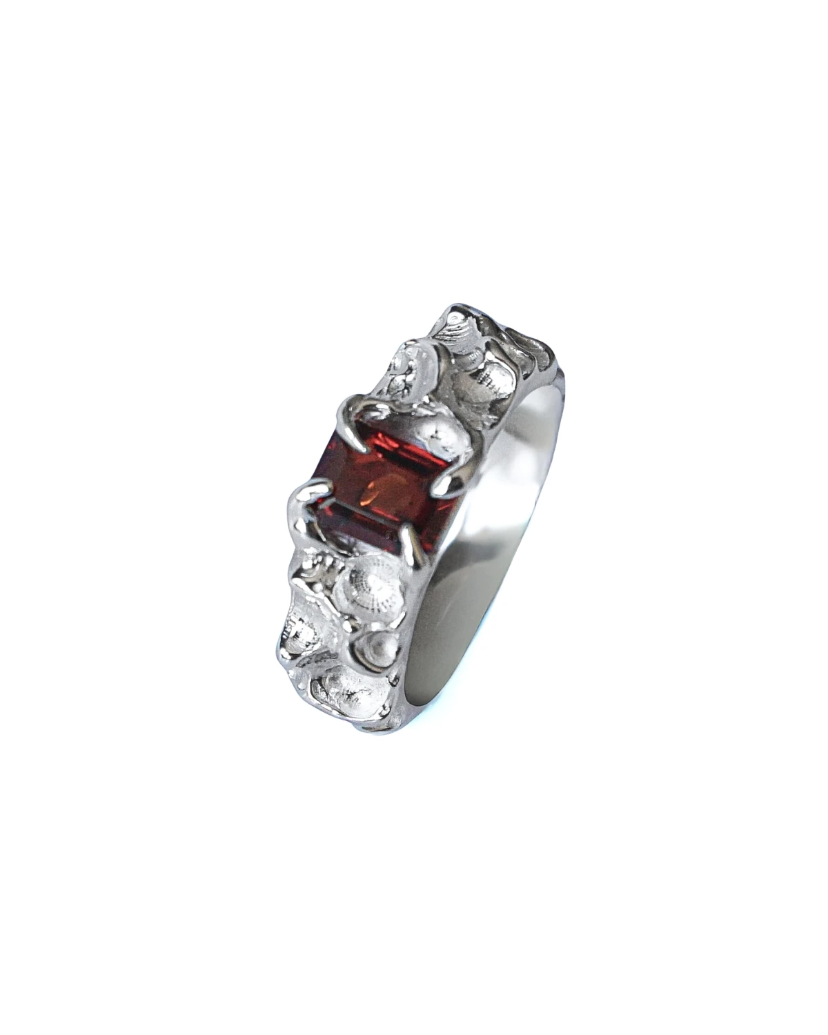 Srebrny nieregularny pierścionek z granatem. Wykonany w srebrze próby 925.