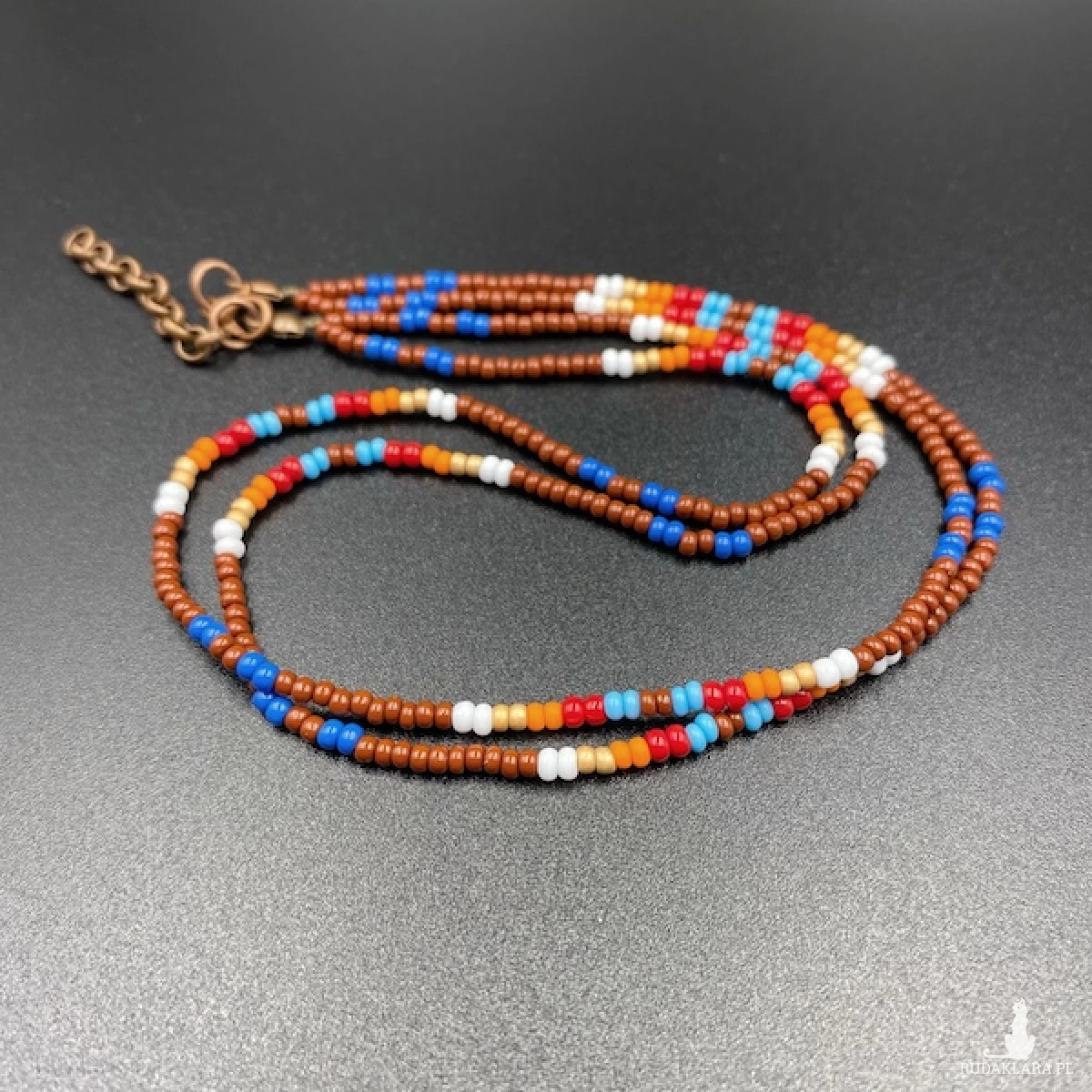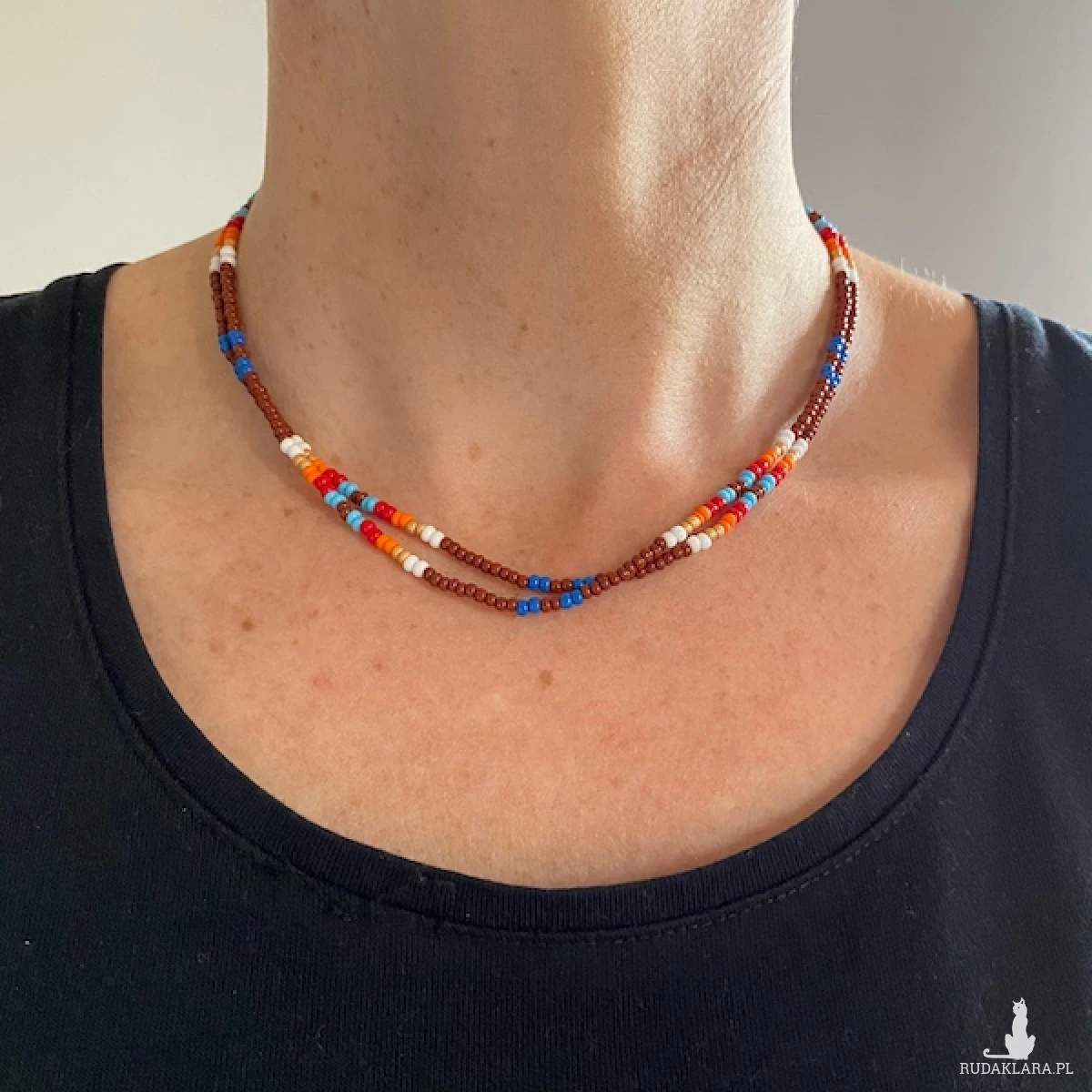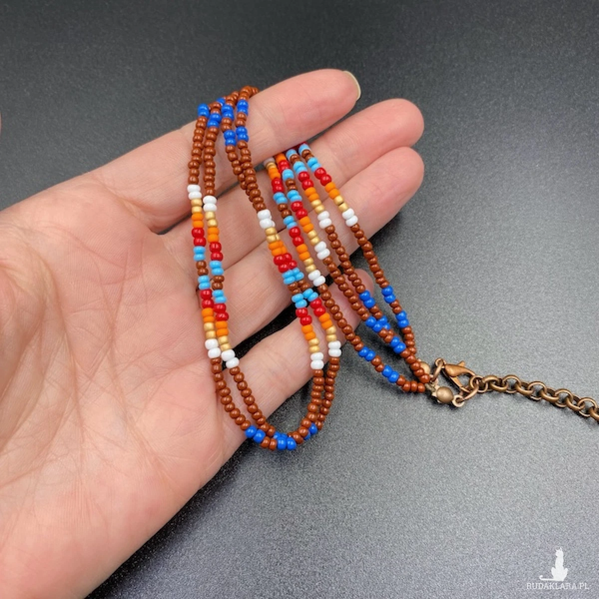 Krótki naszyjnik ( złożony z dwóch sznurów ) został wykonany ręcznie ze szklanych koralików 2,7 - 3 mm w kolorze: brązowym, niebieskim, czerwonym, miodowym, białym, pomarańczowym. Elementy metalowe w kolorze miedzi.