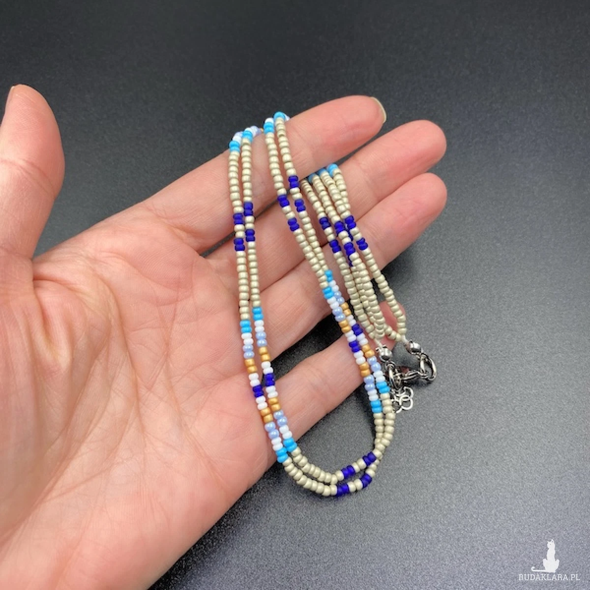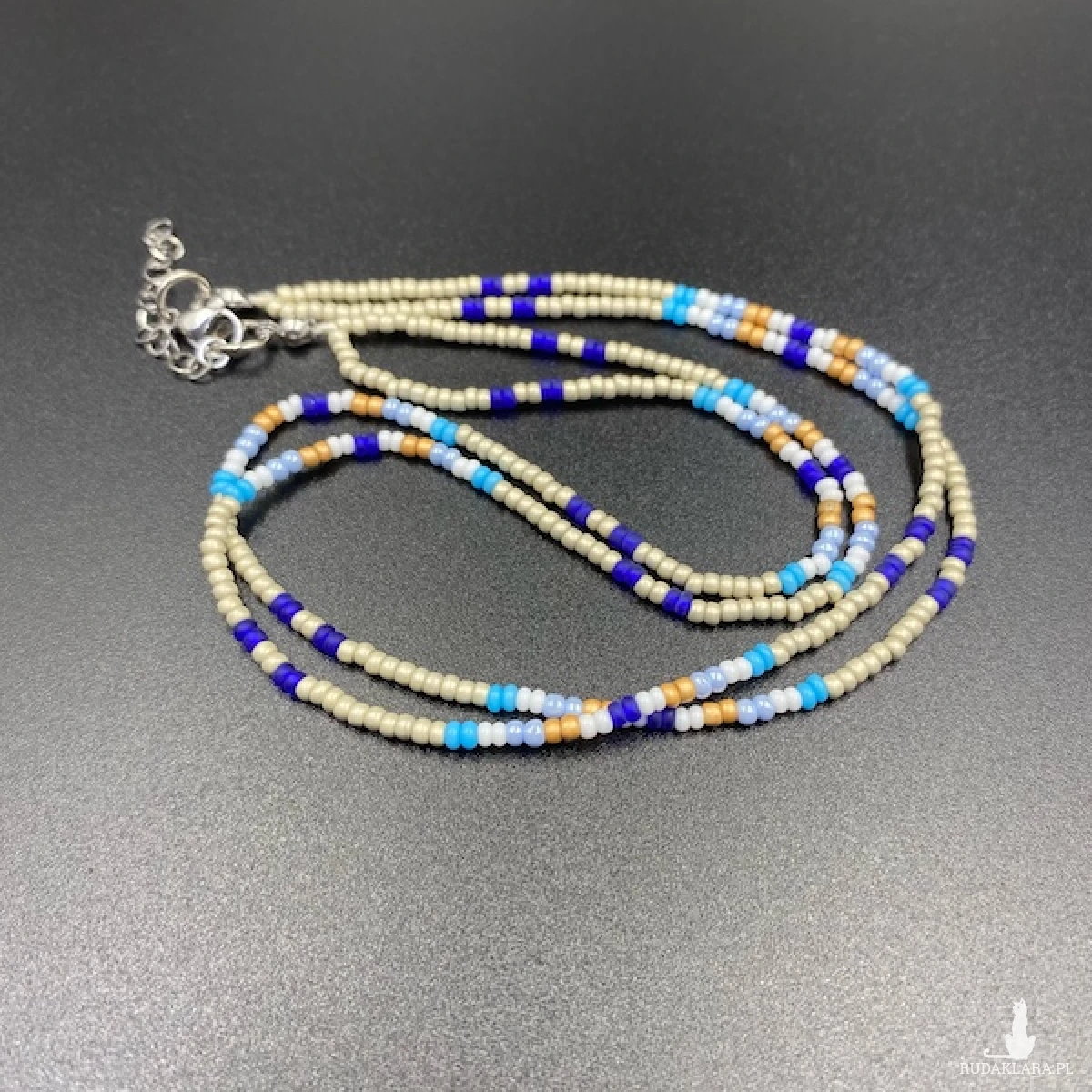 Krótki naszyjnik ( złożony z dwóch sznurów ) został wykonany ręcznie ze szklanych koralików 2,7 mm w kolorze brudnego beżu, białym, niebieskim, granatowym, miodowym. Elementy metalowe ze stali chirurgicznej w kolorze srebrnym.