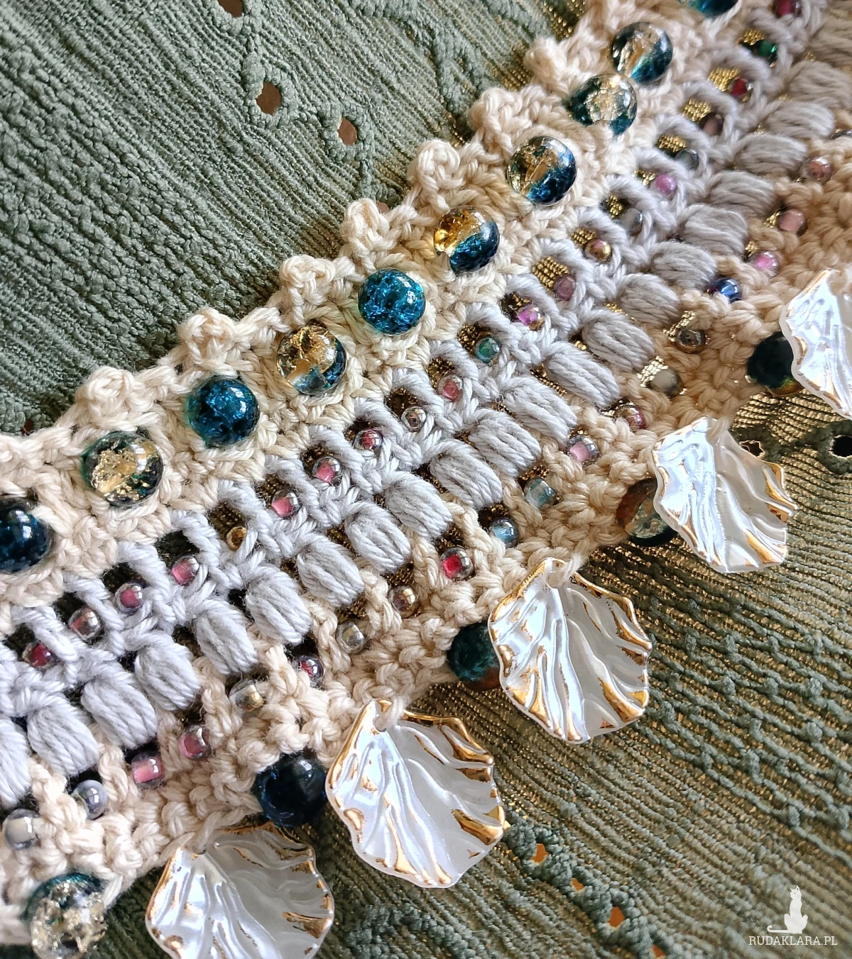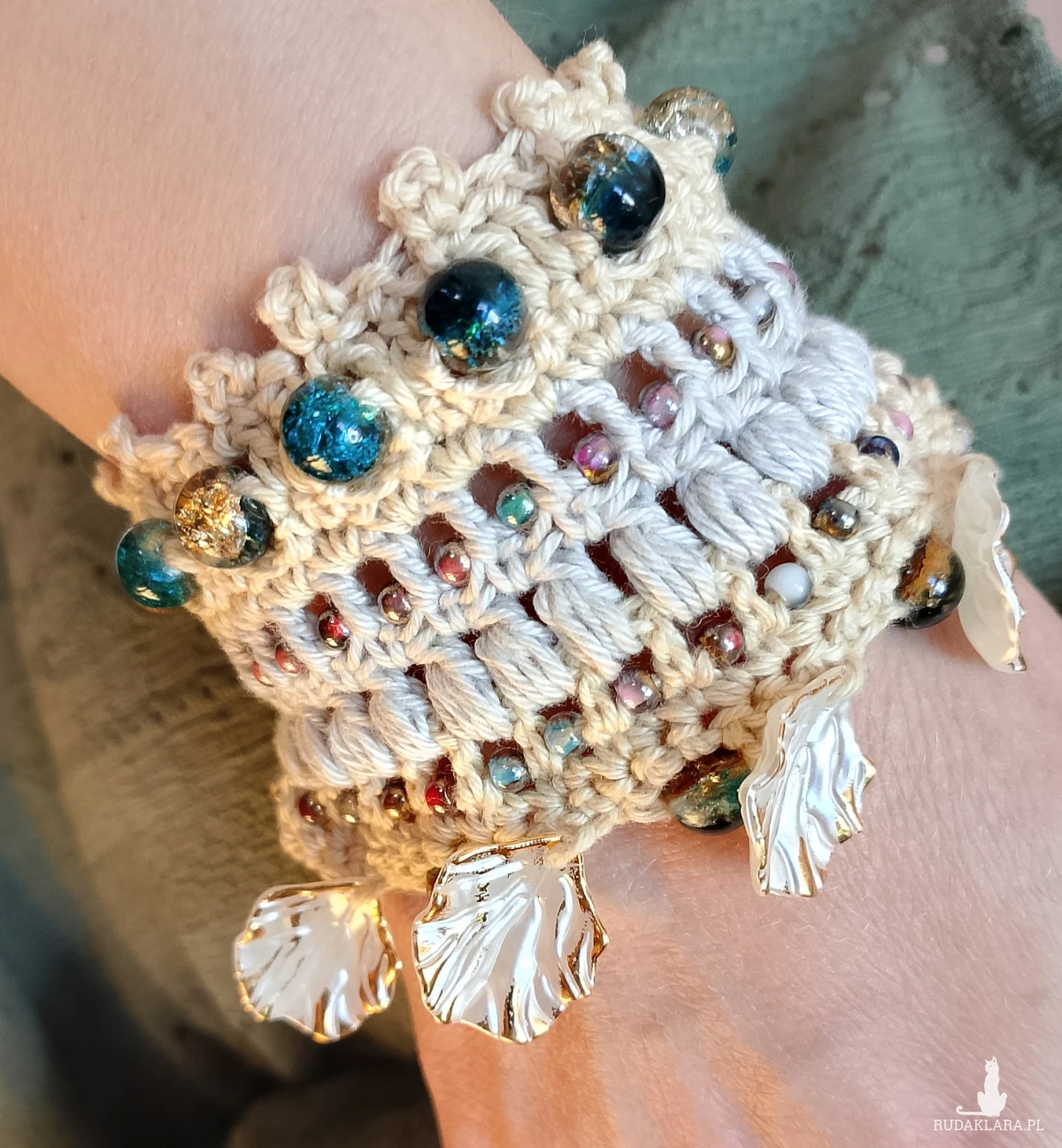 Bransoletka wykonana koronkowym wzorem, ozdobiona koralikami. Jest