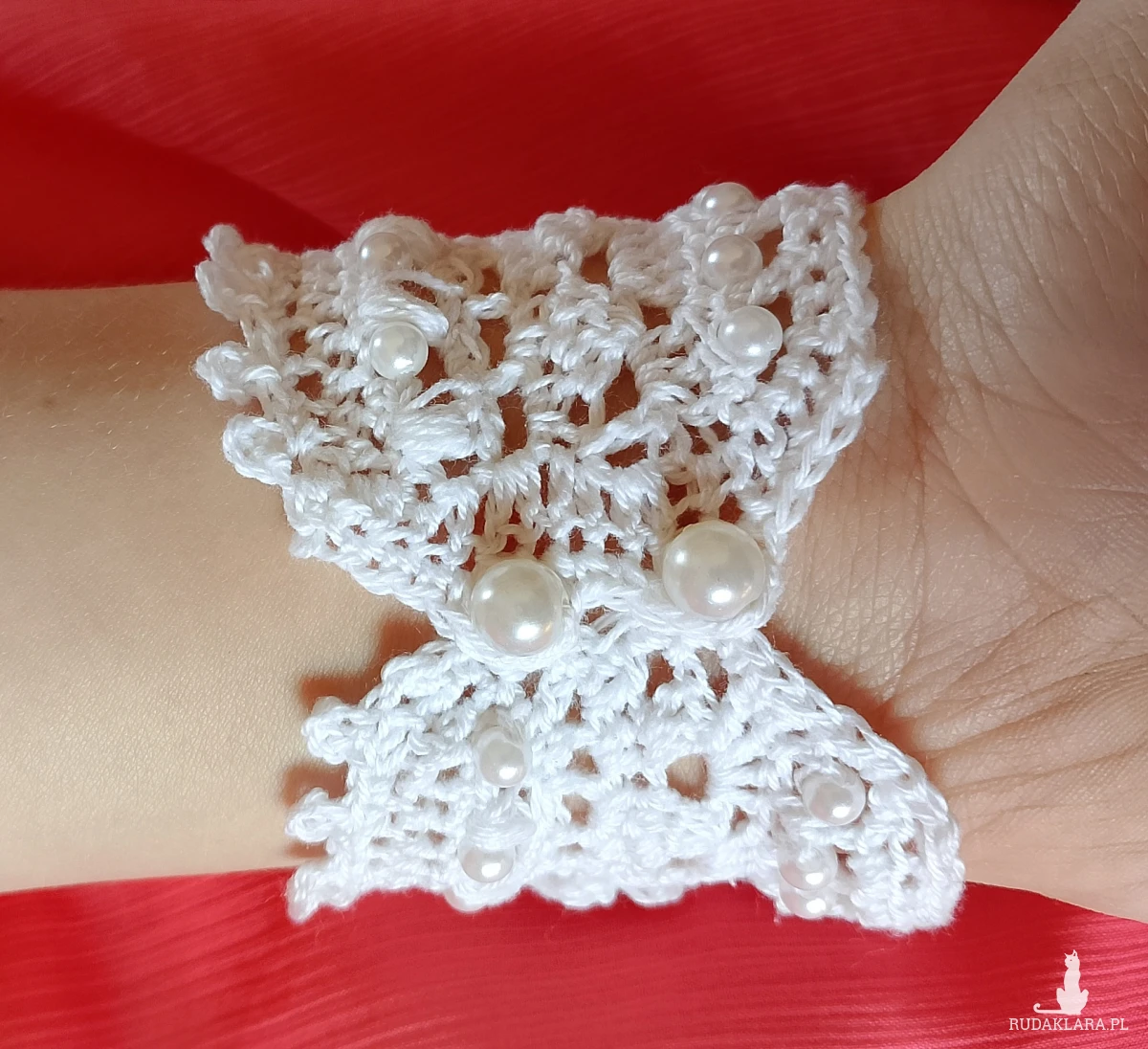 Bransoletka wykonana koronkowym wzorem, ozdobiona perłowymi koralikami.