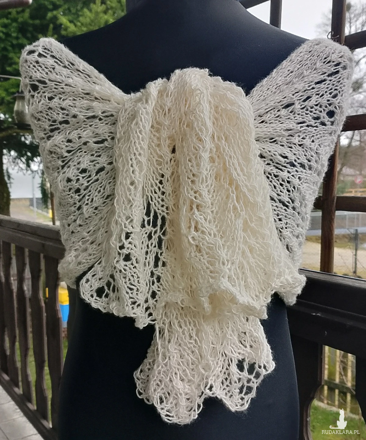 delikatnego w dotyku. Szal jest leciutki i ulotny jak mgiełka, a przy