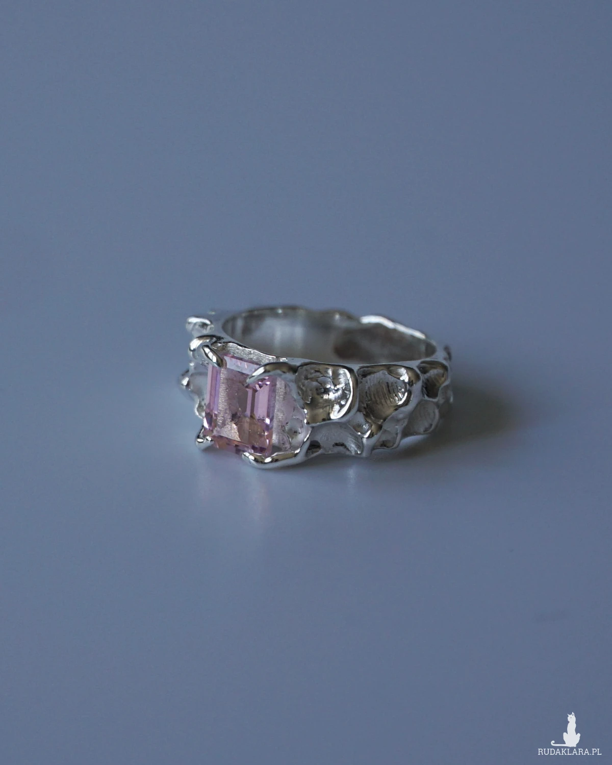 Srebrny nieregularny pierścionek z różowym kwarcem. Wykonany w srebrze próby 925.