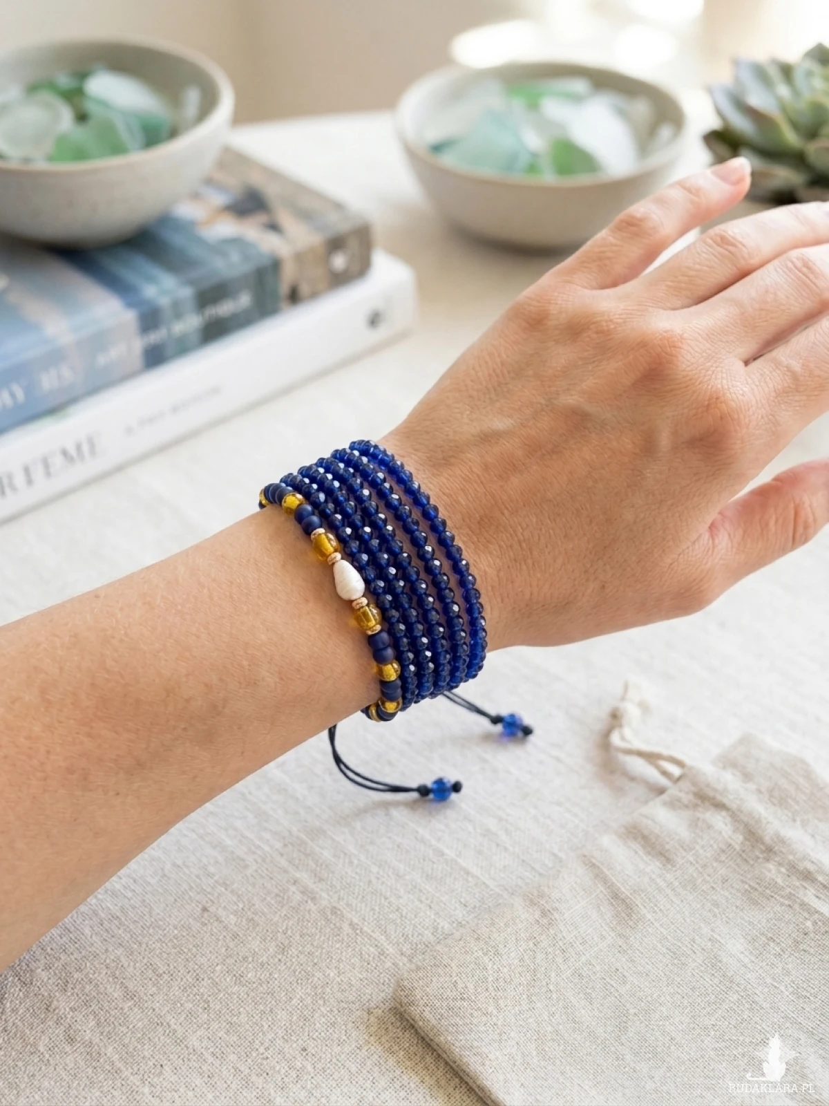 Poczuj morską bryzę bez względu na porę roku. Ta wyjątkowa bransoletka to połączenie głębokiego błękitu z naturalnym urokiem białej muszli. Ręcznie wykonana z dbałością o każdy detal, idealnie komponuje się z letnimi sukienkami i casualowym stylem. Regulowane zapięcie zapewnia komfort noszenia na każdym nadgarstku.