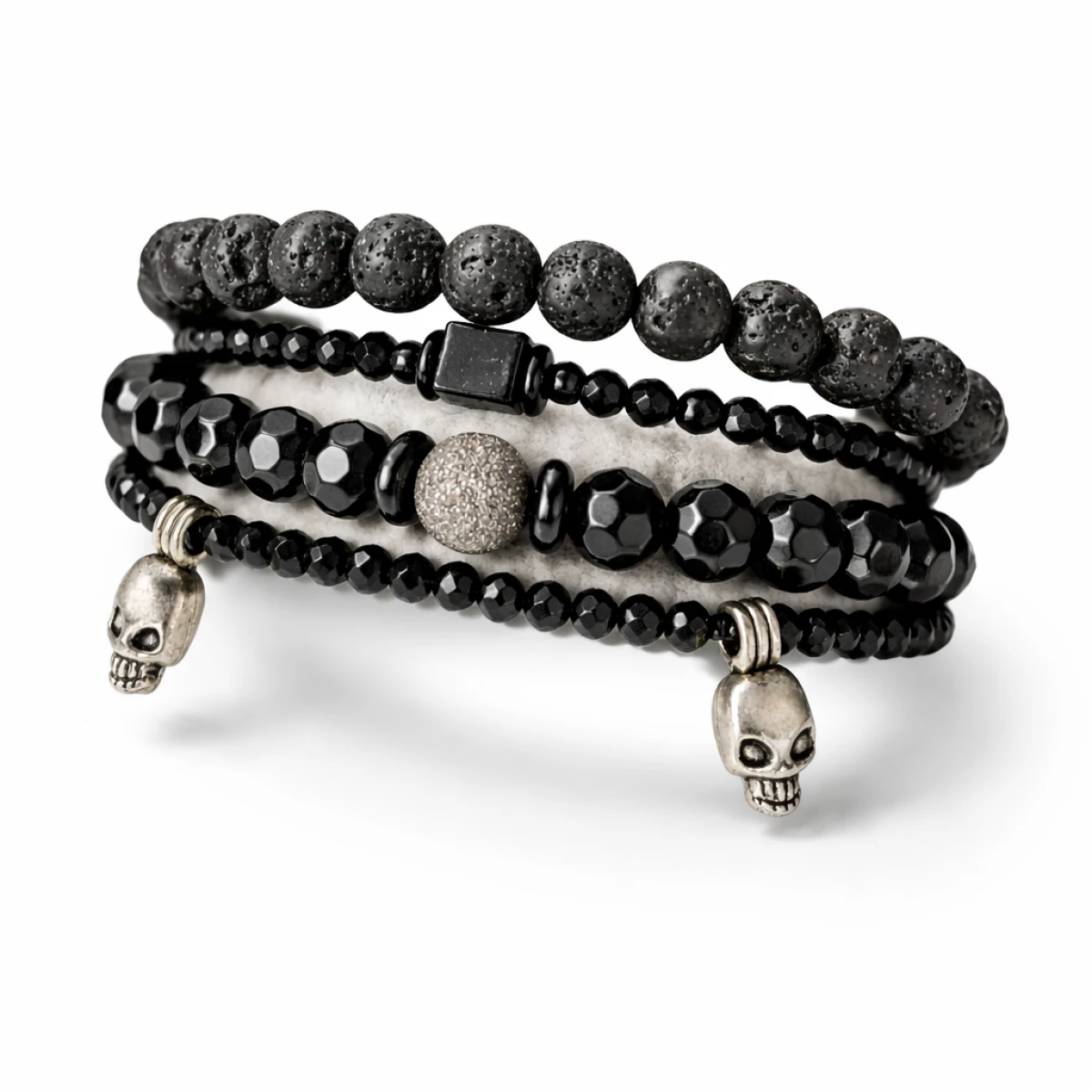 Bransoletka z czarnych koralików szklanych i kulek lawy wulkanicznej. Kulka pył księzycowy srebrna i maleńkie czaszki. Czarny sznurek syntetyczny.  Zapięcie wyplecione ściegiem makramowym pozwala na dopasowanie bransoletki do nadgarstka, przechodzi przez dłoń ok 20 cm