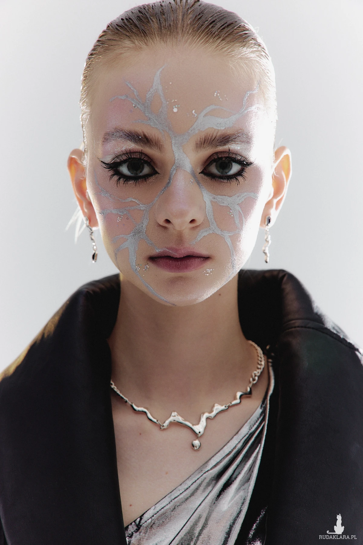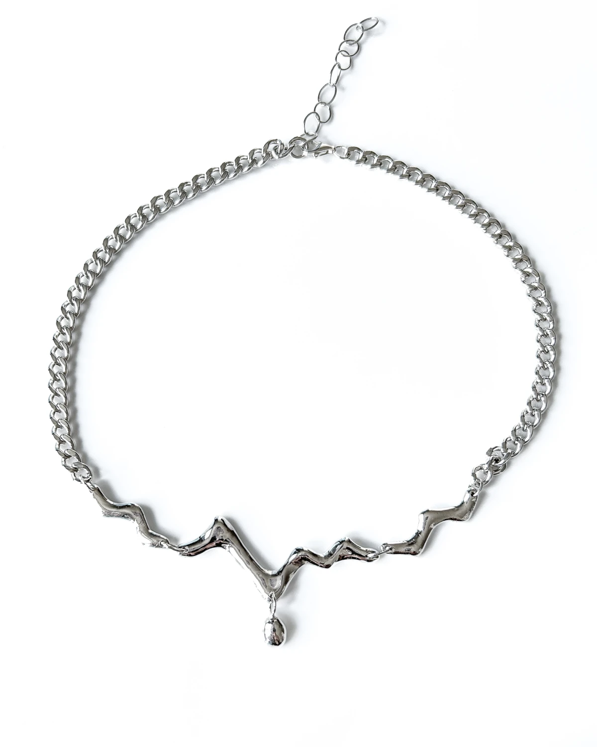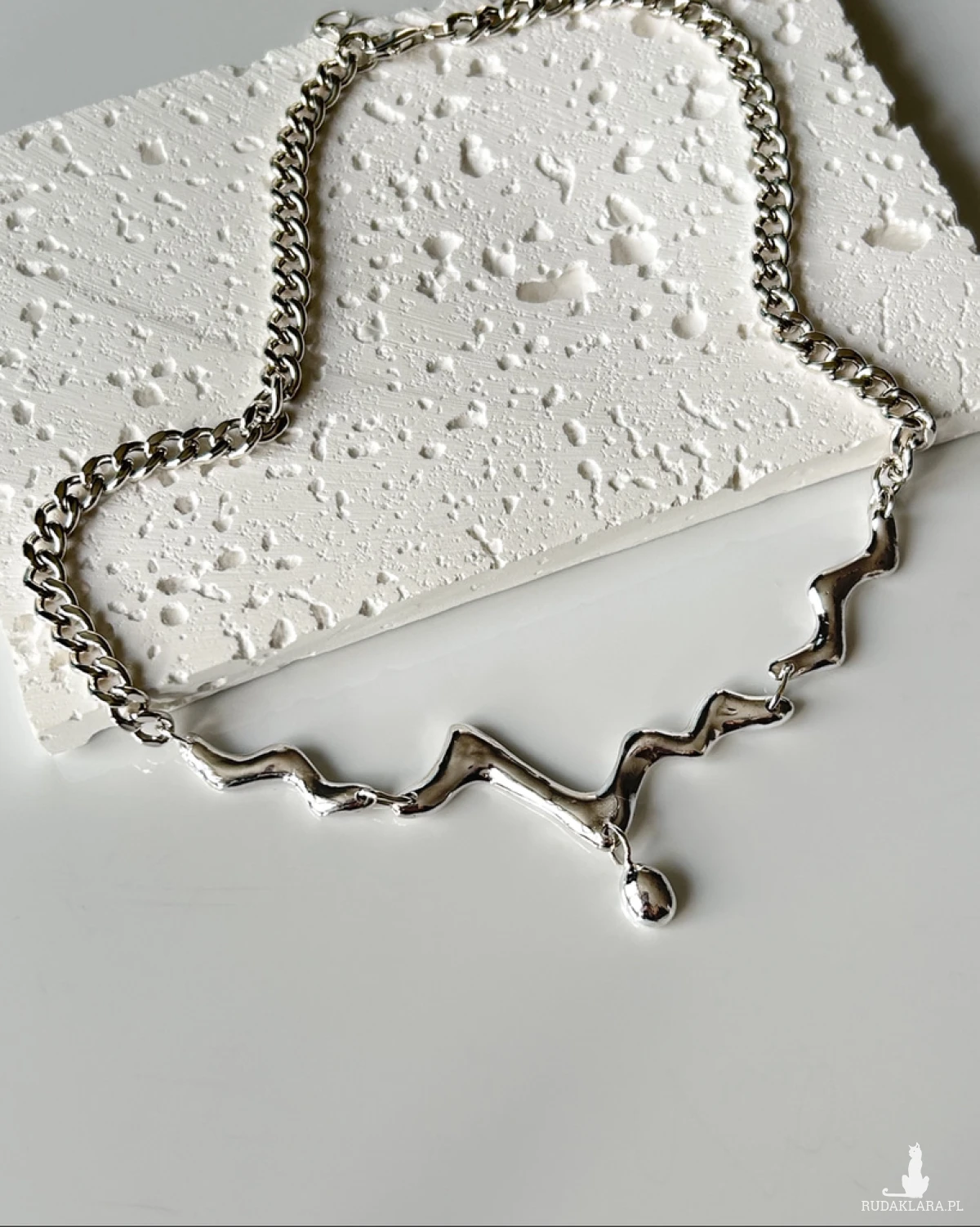 Nieregularny naszyjnik w formie lejącego, ociekającego srebra, z wiszącą kroplą.
