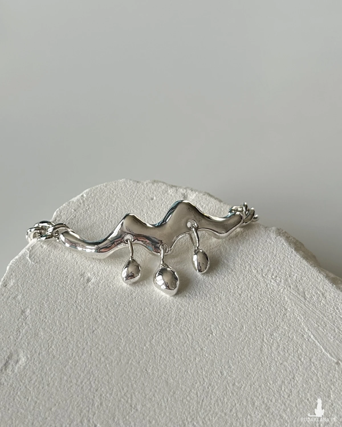 Nieregularna bransoletka w formie lejącego się i ociekającego srebra z wiszącymi kroplami.