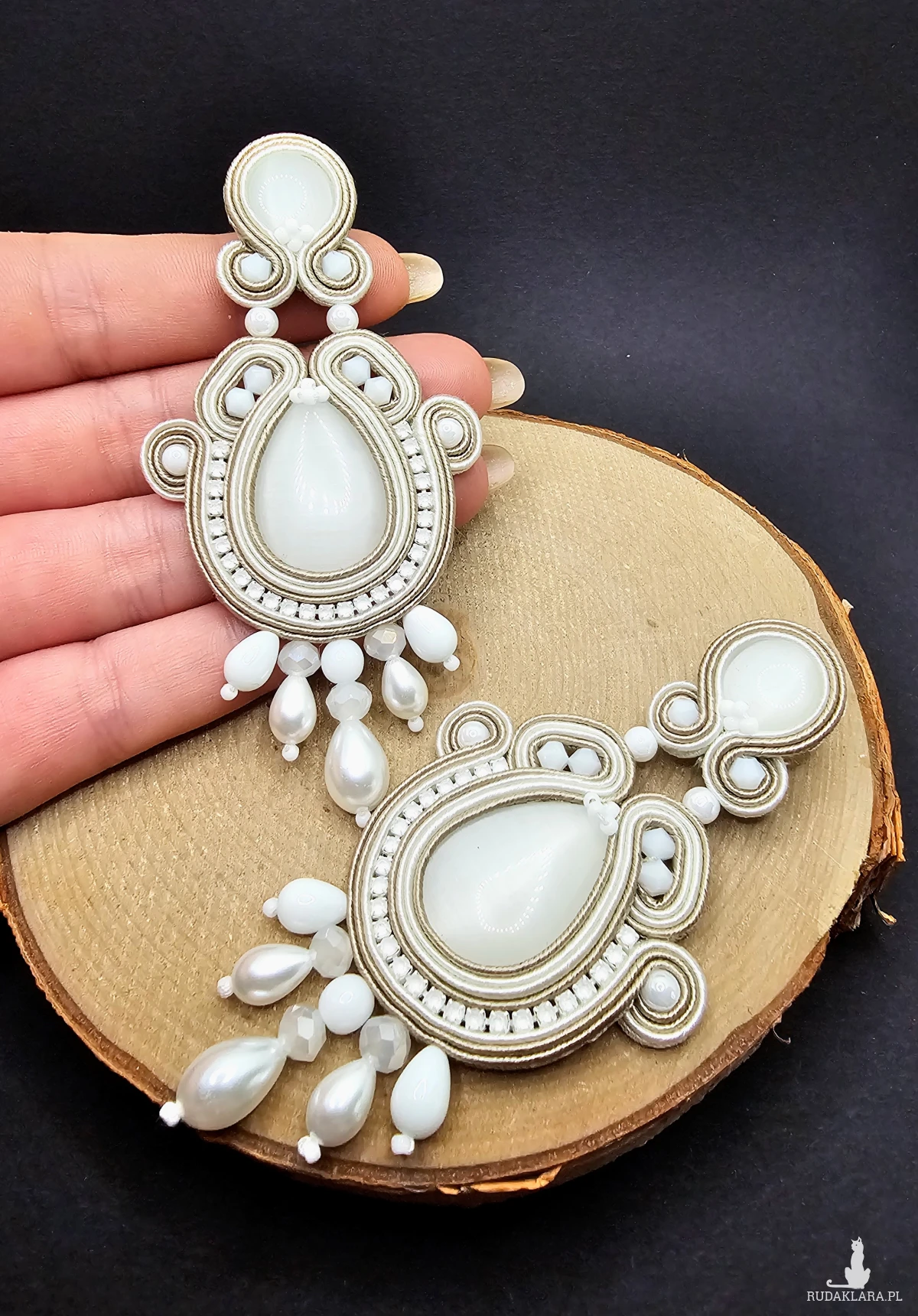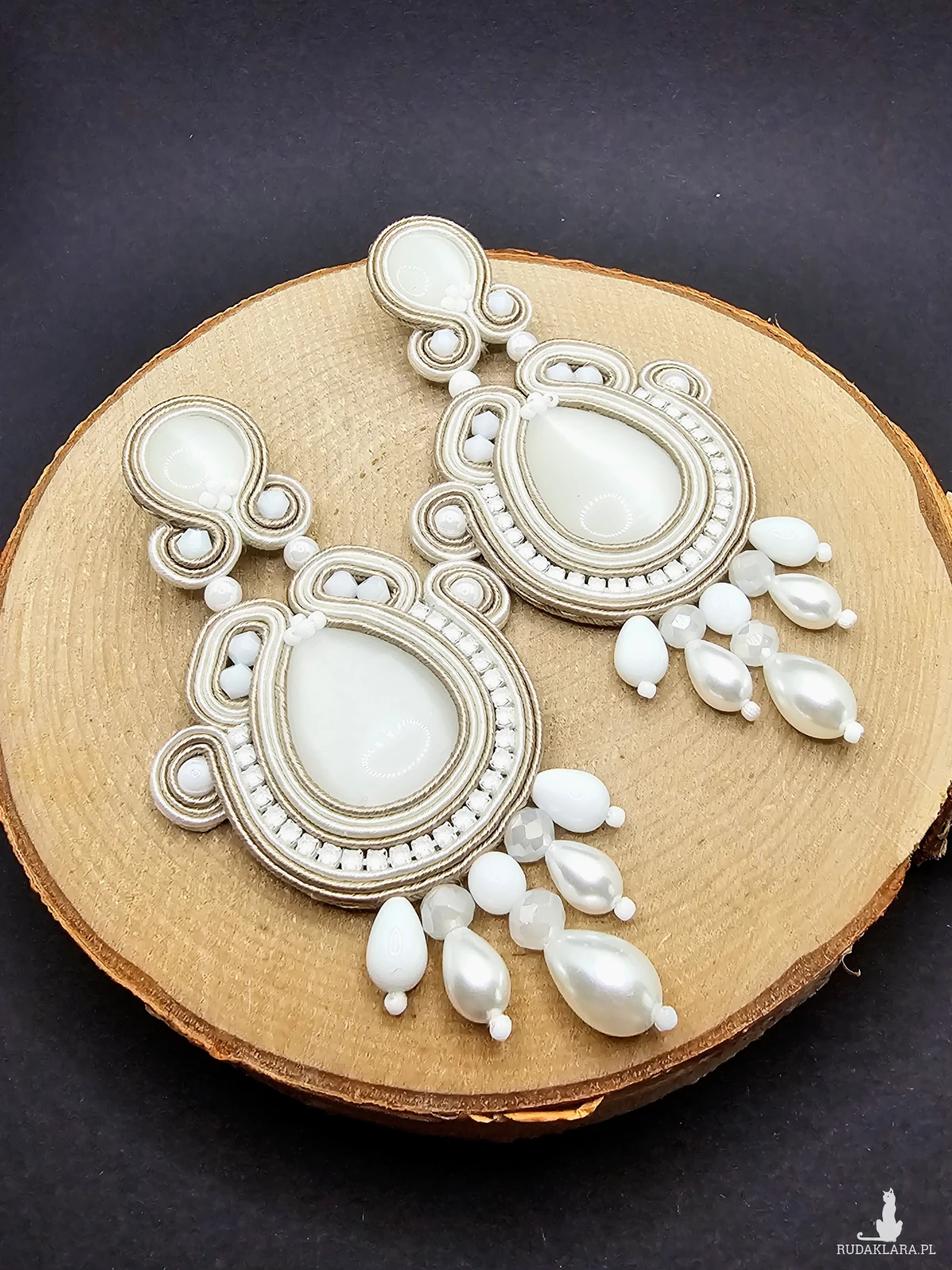 Biało beżowe długie kolczyki sutasz z kocim okiem