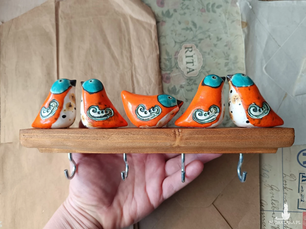 Stylizowany wieszak drewniany o długości 22 cm, z delikatnym frezem, na 4 haczyki, ozdobiony ceramicznymi ptaszkami wykonanymi z gliny ceramicznej. Dodatki wypalone zostały na biskwit, a następnie poszkliwione w temperaturze 1260 stopni C. Z tytułu wygodne mocowanie w postaci zawieszek. Serdecznie polecam!!!