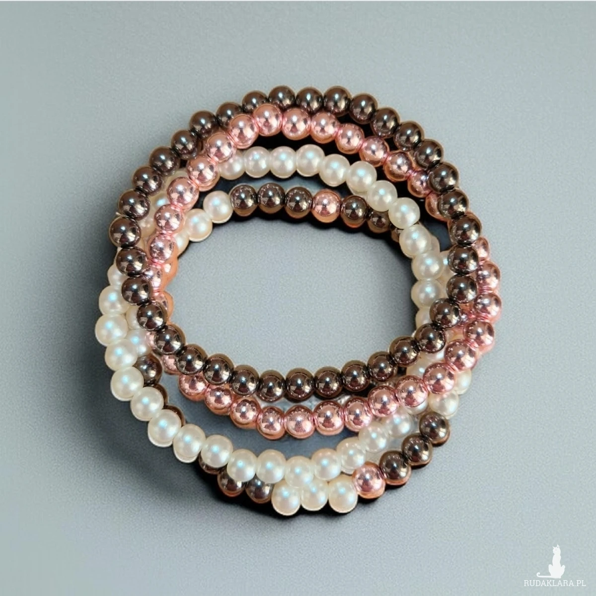 Sprzedam piękny zestaw czterech bransoletek wykonanych z koralików w eleganckiej kolorystyce: perłowej bieli, różowego złota oraz grafitu. Idealne do noszenia razem lub osobno – pasują zarówno do codziennych stylizacji, jak i na wyjątkowe okazje.