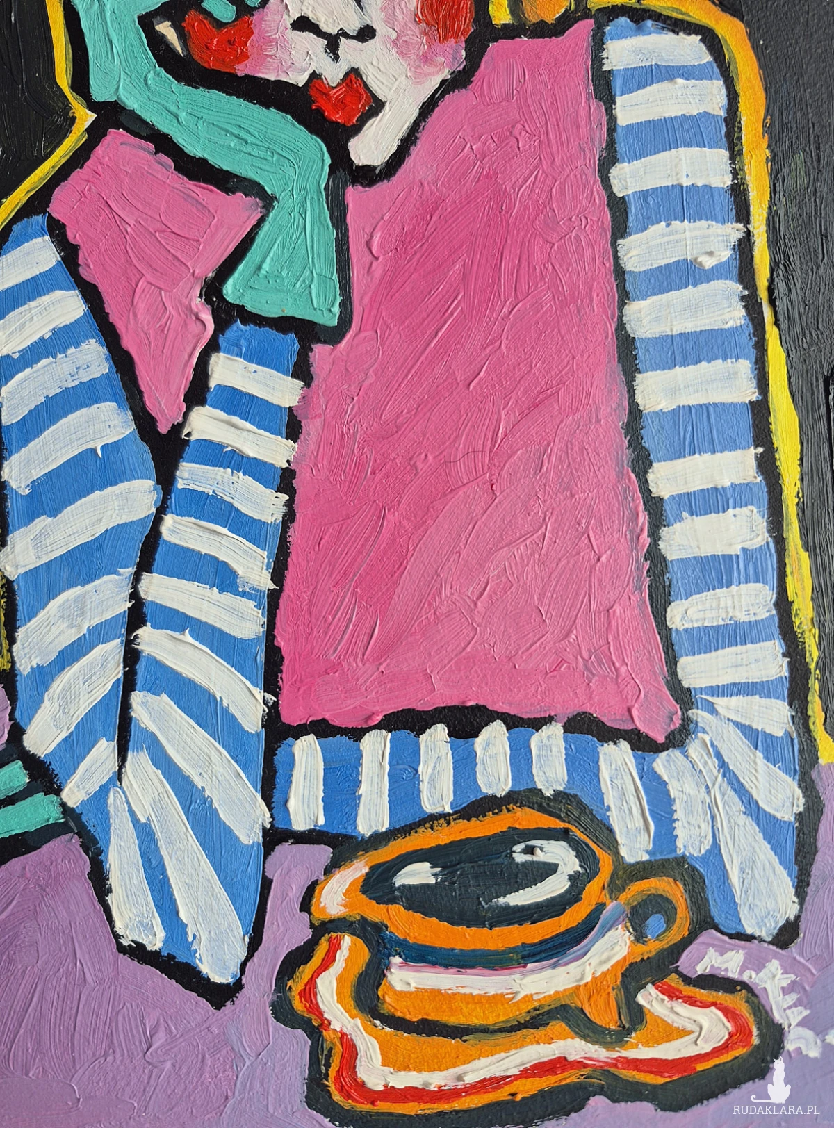 Obraz pulsuje intensywnością barw i emocji, balansując na granicy naiwności i świadomej deformacji. Centralna postać — kobieta o przerysowanych rysach, ukryta za grubymi konturami i kontrastowymi plamami koloru — zdaje się zawieszona w stanie cichej zadumy. Jej twarz, niemal maskowata, z wyraźnie zaznaczonymi rumieńcami i zamyślonym spojrzeniem, niesie w sobie nutę melancholii, ale i subtelnej ironii.
