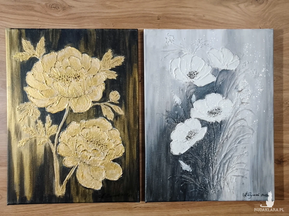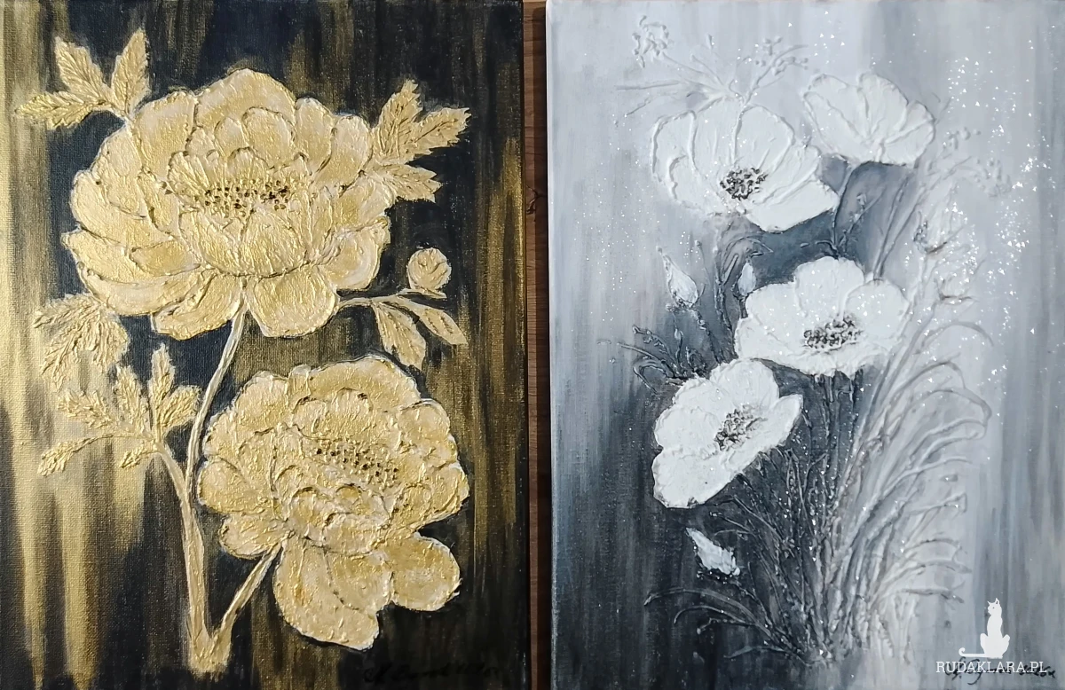 Obrazy strukturalne, łączące w sobie nowoczesną formę z głęboką teksturą 3D dopełnią wnętrze nutą luksusu. Unikatowe, ręcznie wykonane obrazy na płótnie łączą surowość z elegancją. Kwiaty zostały naniesione grubą warstwą pasty strukturalnej, dzięki czemu dosłownie "wychodzą z płótna", co daje efekt niesamowitej głębi. Obraz pięknie pracuje ze światłem, zmieniając swój wygląd w zależności od pory dnia. Nie są to wydruki, lecz autorskie dzieła z wyraźnym śladem ręki artysty. Mogą wisieć razem jako zestaw lub oddzielnie tworząc spójną kompozycję wnętrz.