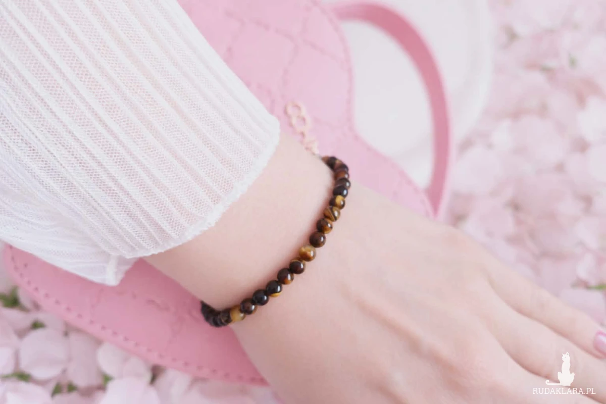 Bransoletka wykonana na trwałej lince jubilerskiej, z naturalnych kamieni tygrysiego oka oraz elementów ze stali chirurgicznej wysokiej jakości z nieścieralną powłoką. Zapięcie klasyczne na karabińczyk z przedłużką 3 cm pozwala idealnie dopasować bransoletkę do nadgarstka.