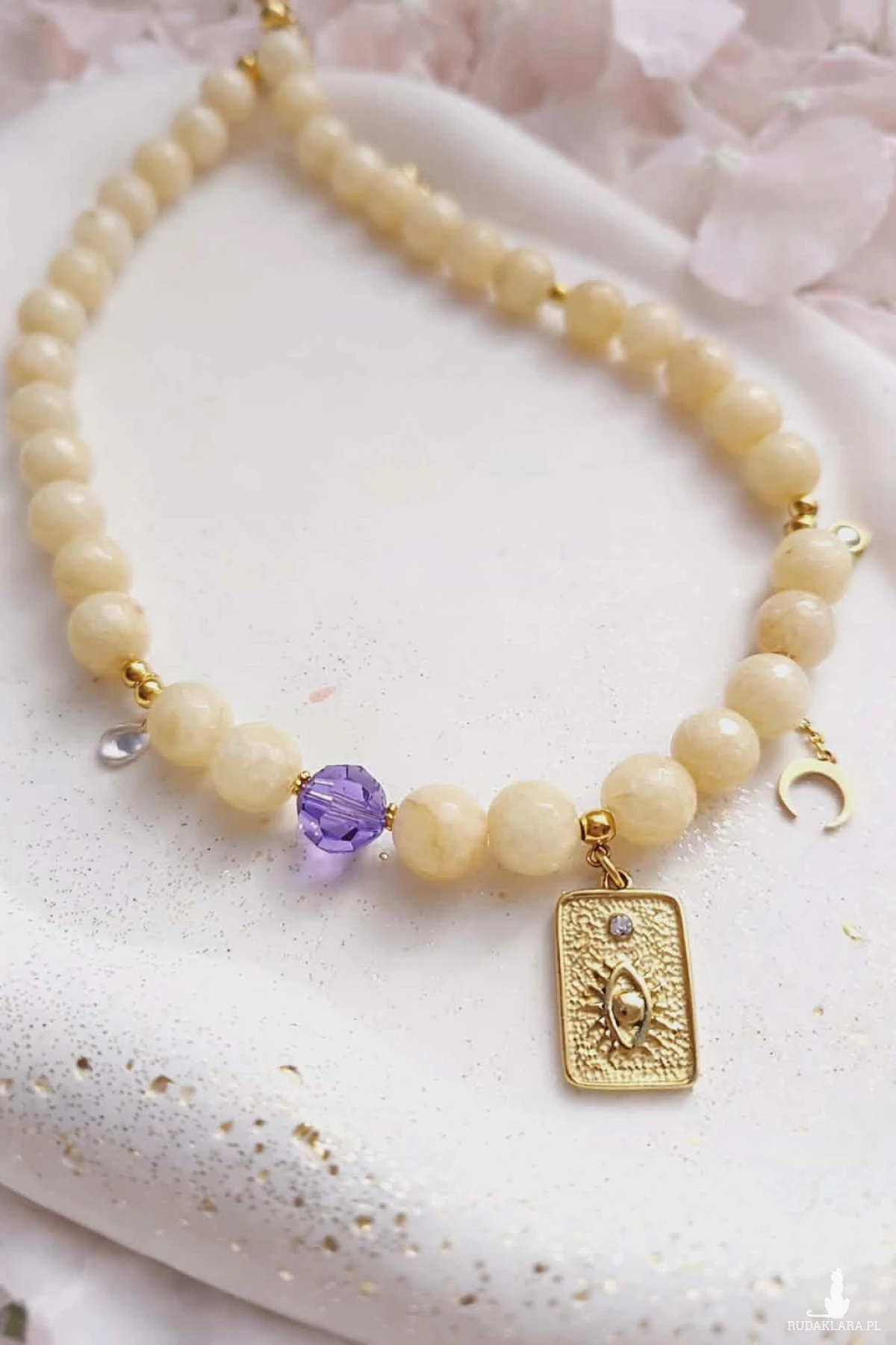 Piękny naszyjnik stworzony z naturalnego nefrytu miodowego w formie kul o średnicy 10 mm, których ciepły, słoneczny odcień przyciąga spojrzenie i otula swoją energią. Całość przełamana została pojedynczym kryształkiem Swarovski w pięknym odcieniu fioletu, dodającym subtelnego blasku i lekkości.