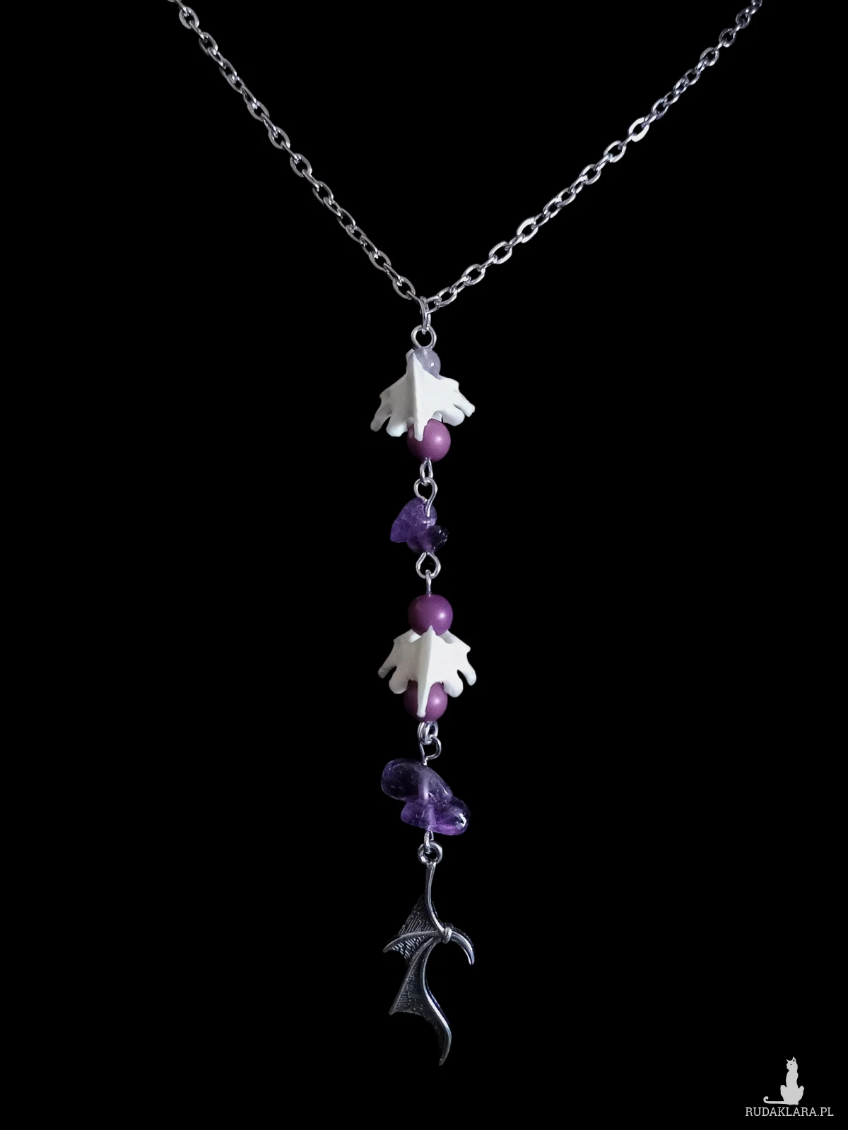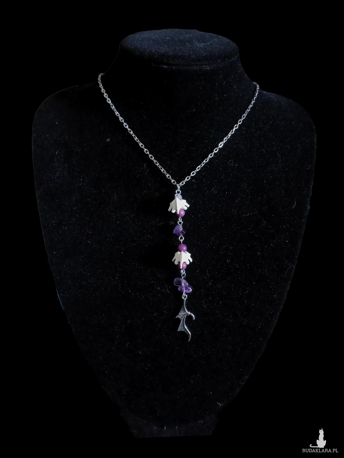 Naszyjnik z zawieszką wykonaną z kręgów axis, ametystu i zawieszki skrzydła, idealny na nadchodzącą wiosnę!
