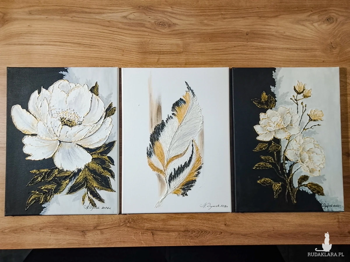 Ręcznie malowany tryptyk, który łączy w sobie delikatność natury z odważnym, nowoczesnym stylem. Centralny motyw pióra, flankowany przez rozkwitające piwonie, tworzy harmonijną opowieść o lekkości i sile. Przepięknie przenikają się biel i czerń jeszcze bardziej kontrastując i wyciągając "głębię" obrazów.