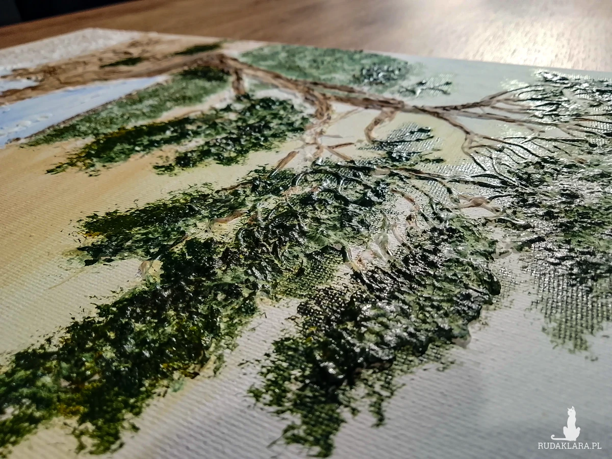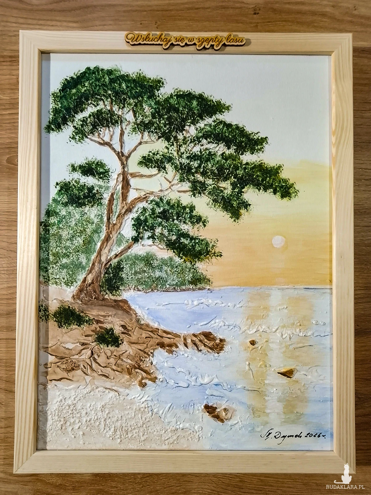 - Tematyka: Klasyczny, kojący pejzaż - drzewa, polana, brzeg skąpany w promieniach słońca