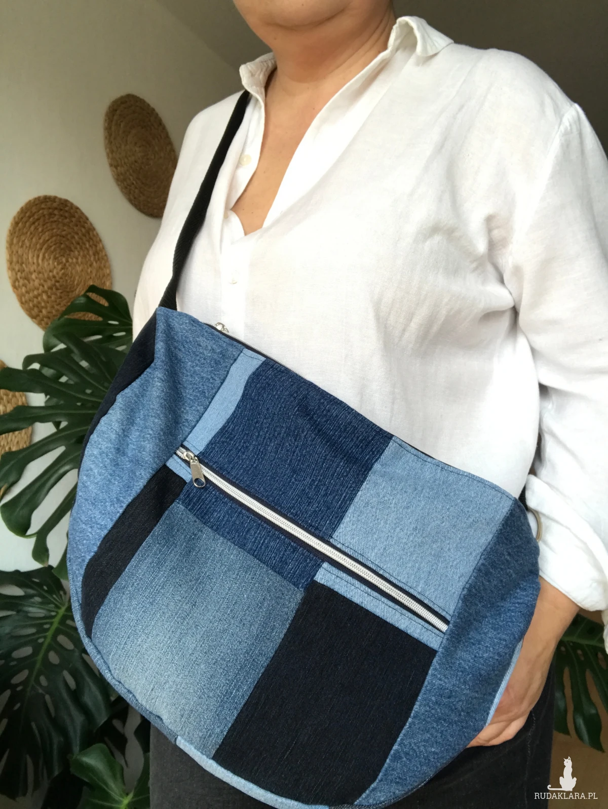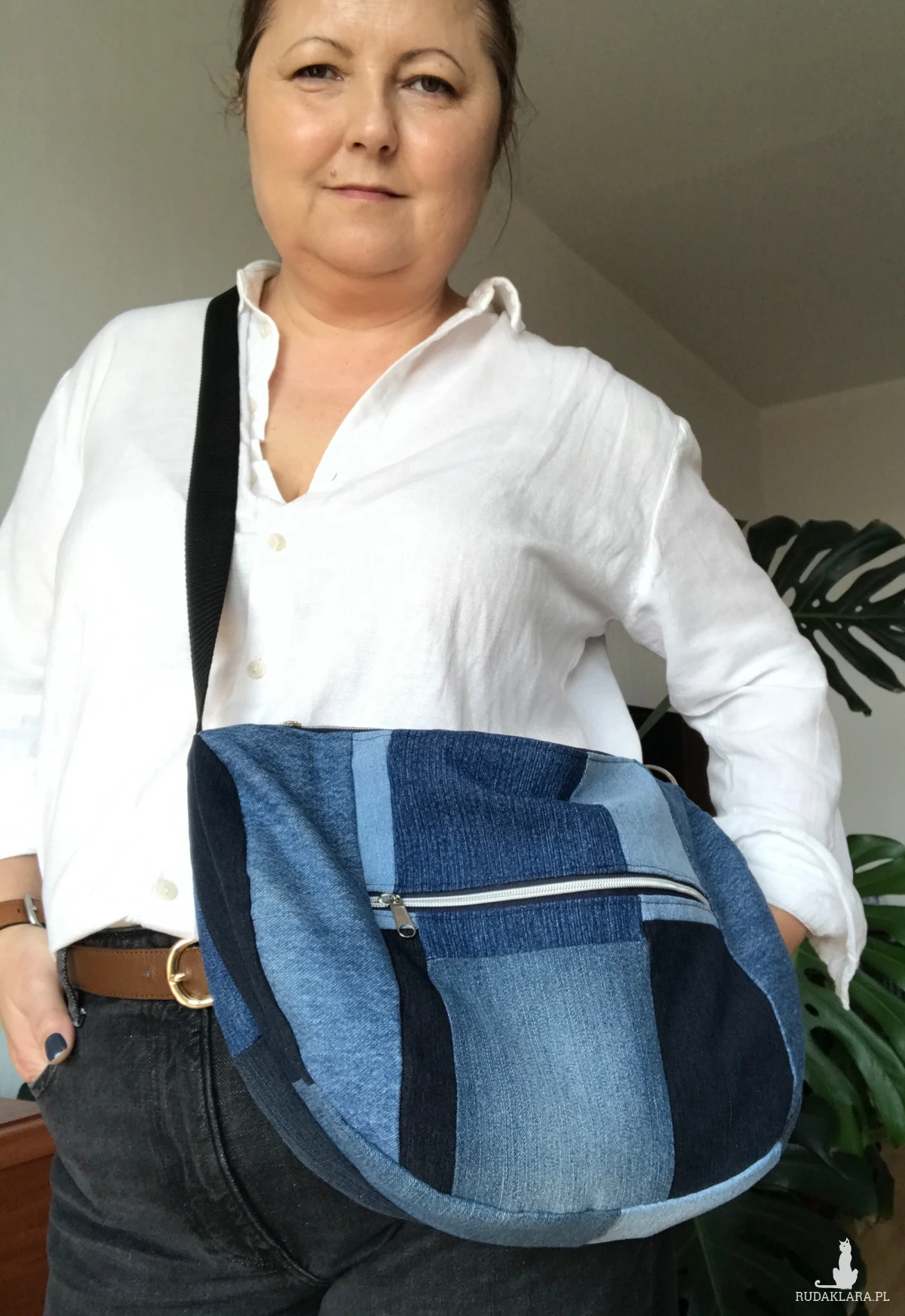 Ta torebka powstała z recyklingowanych spodni jeansowych.