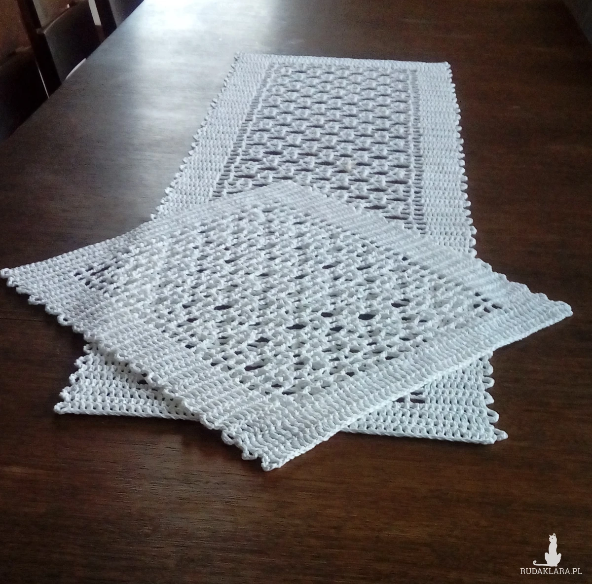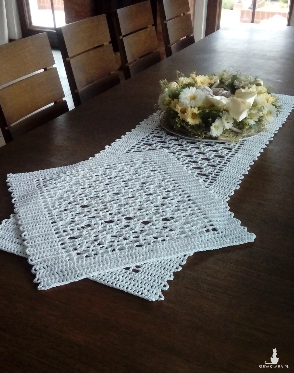 Komplet bieżnik z serwetą w całości wykonany ręcznie, w kolorze białym.