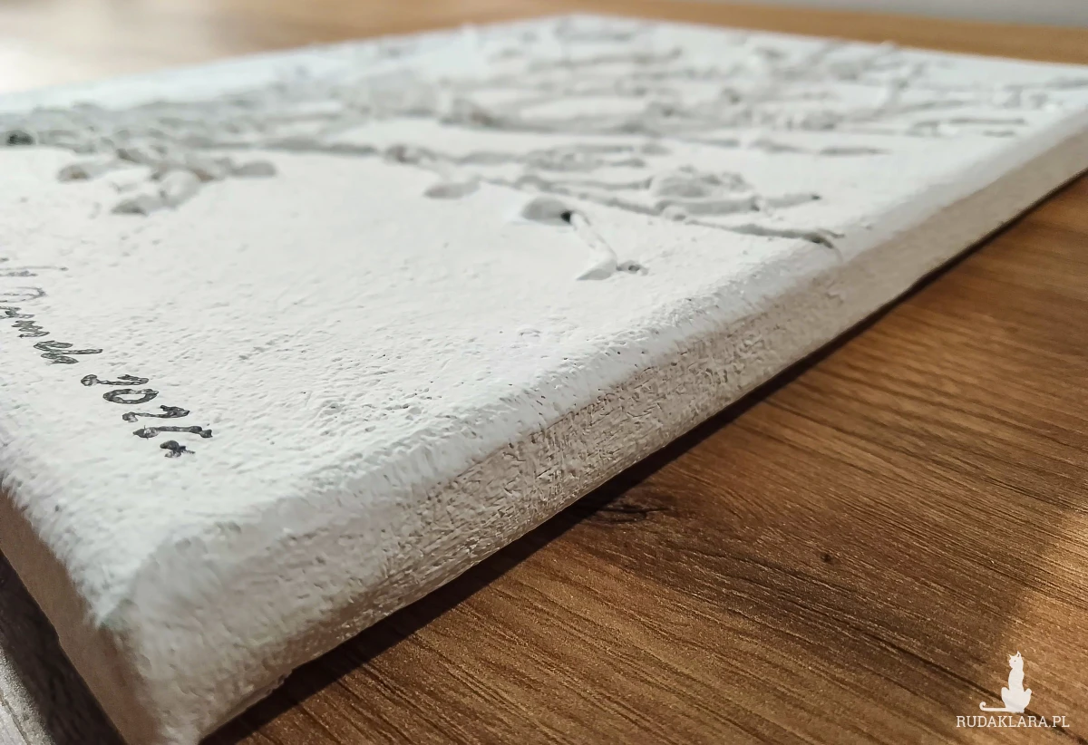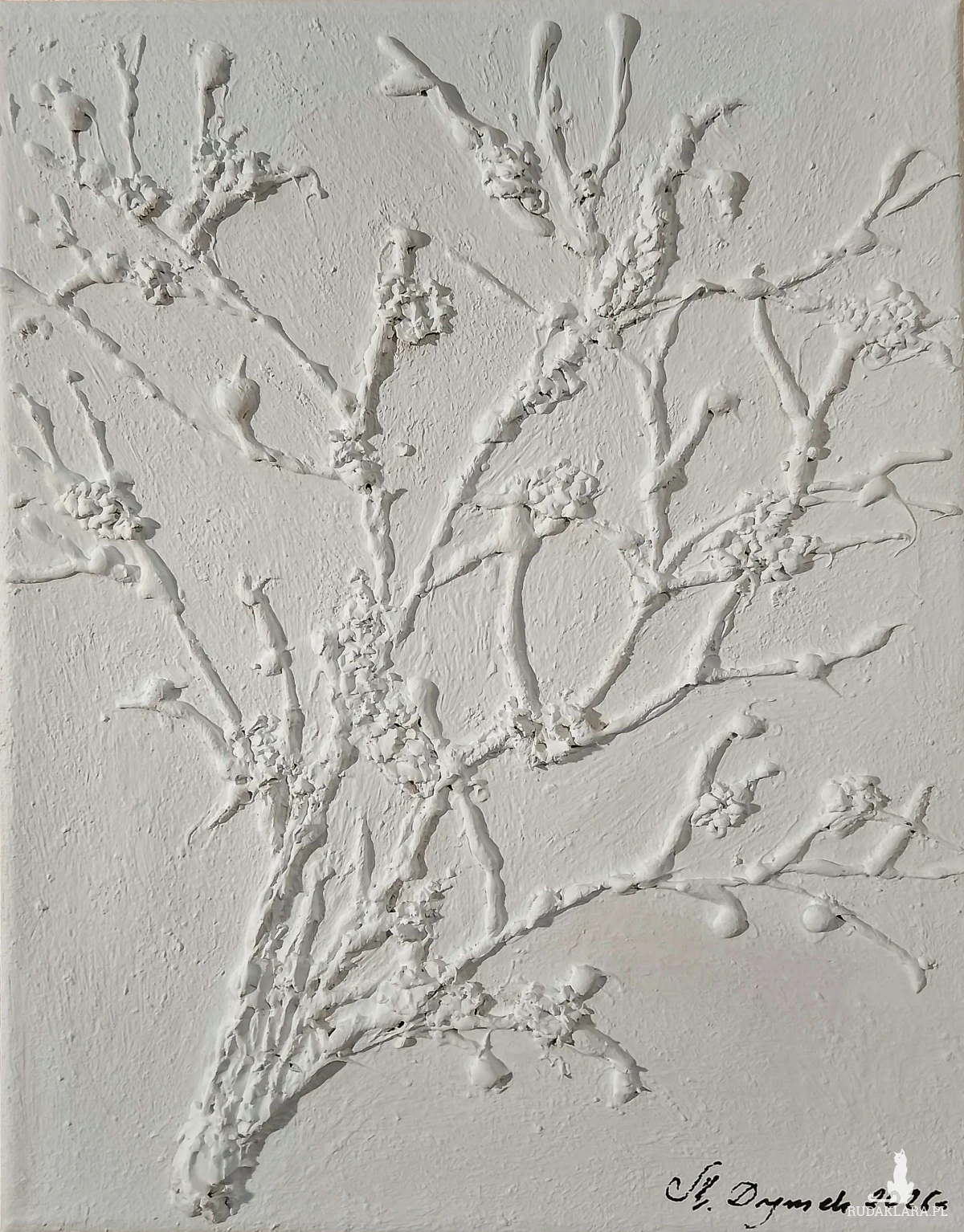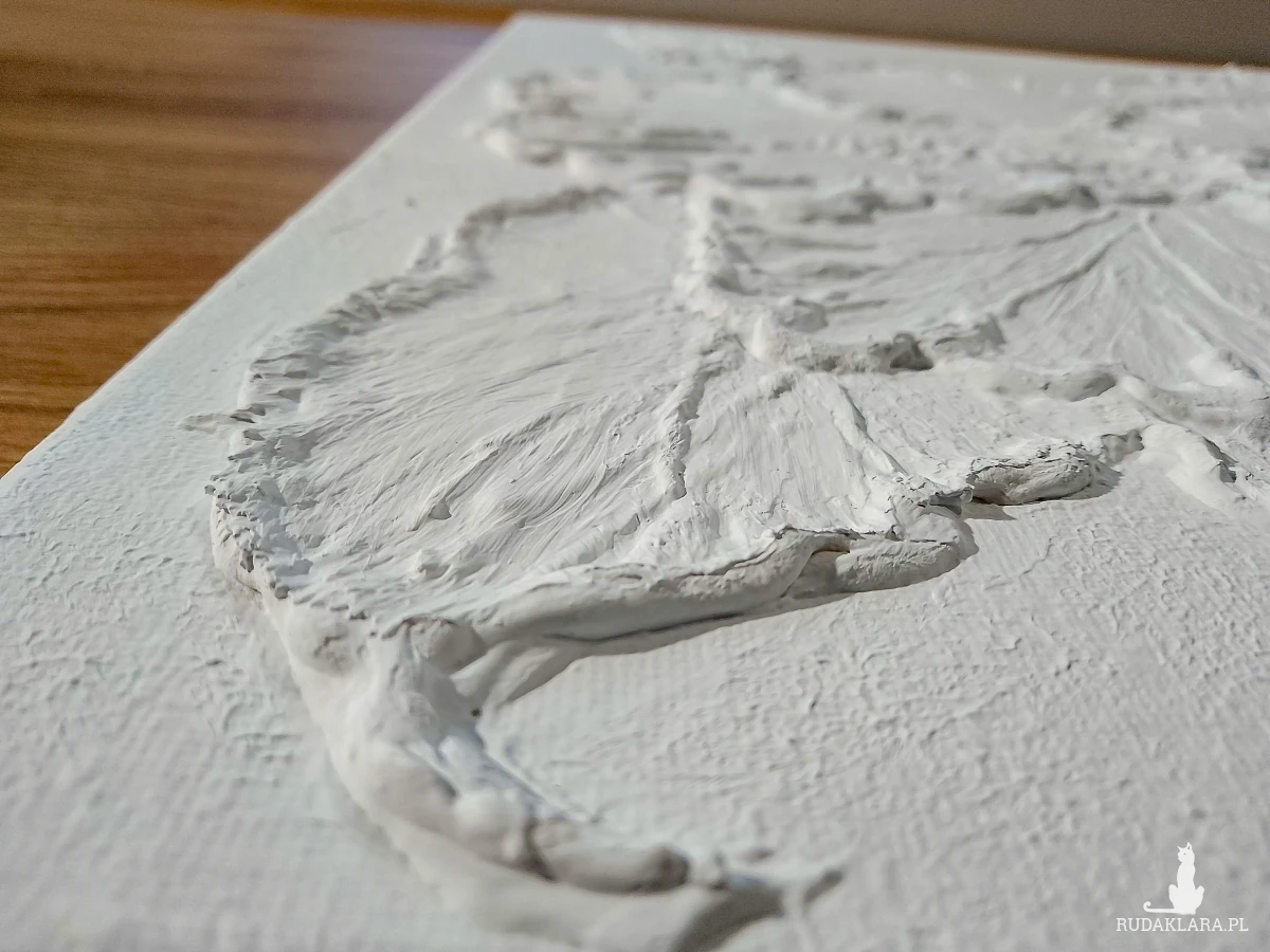 - Technika malarska mieszana: strukturalno-akrylowa - wyraźna faktura przy użyciu pasty strukturalnej tworzy efekt rzeźbiarski