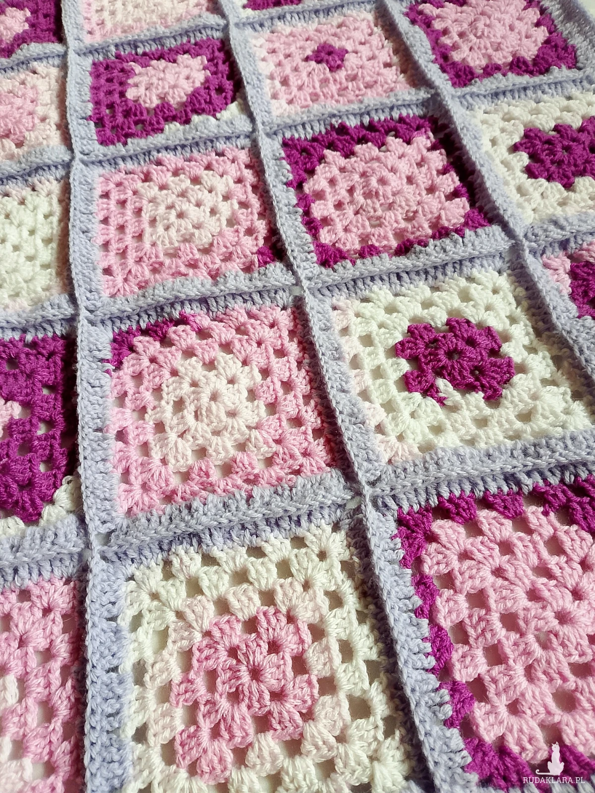 Narzuta w całości wykonana ręcznie z małych kwadratów. Wymiary 135 cm x 95 cm.