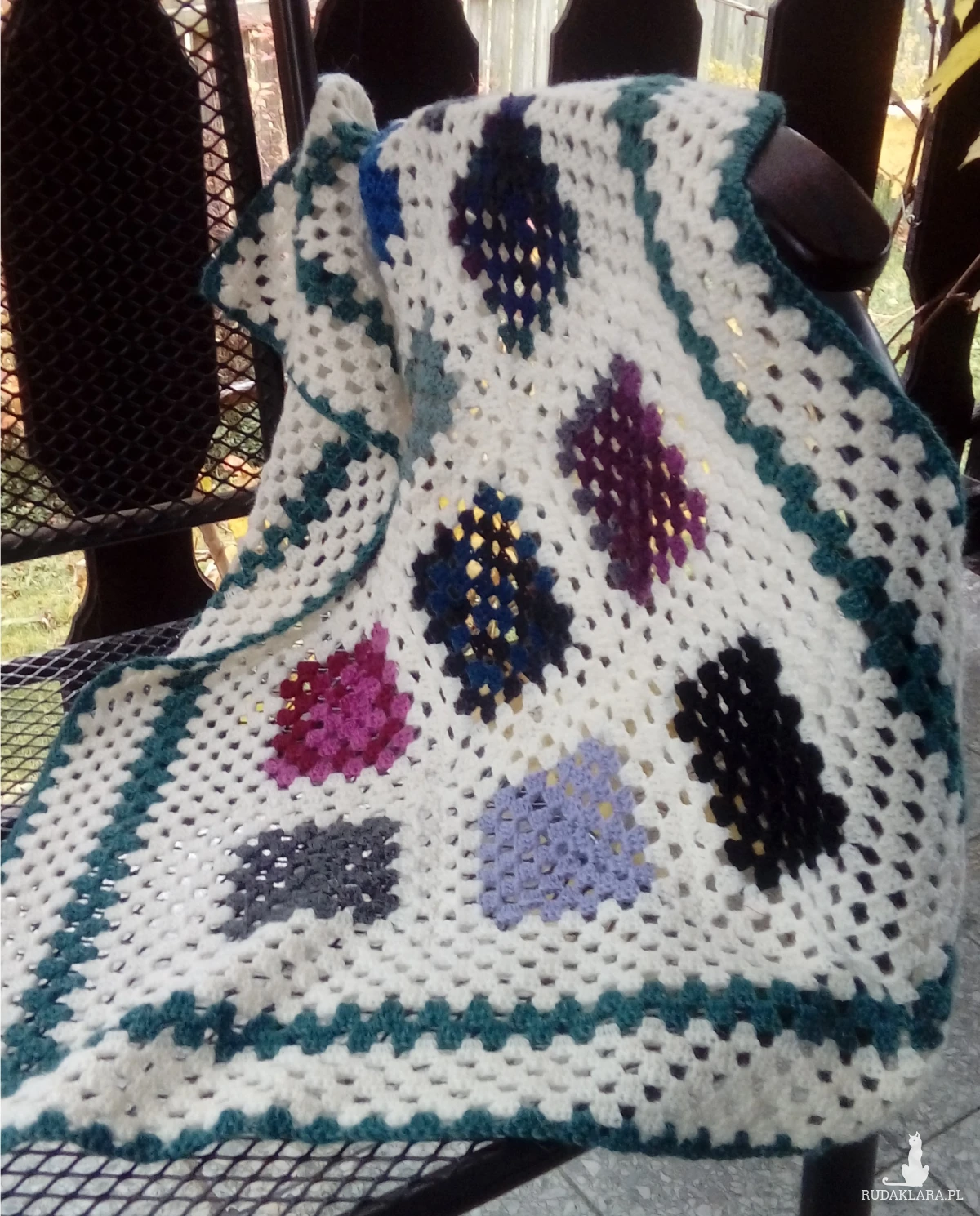 Kocyk wykonany ręcznie z kwadratów. Wymiary 57 cm x 70 cm. Wykonanie